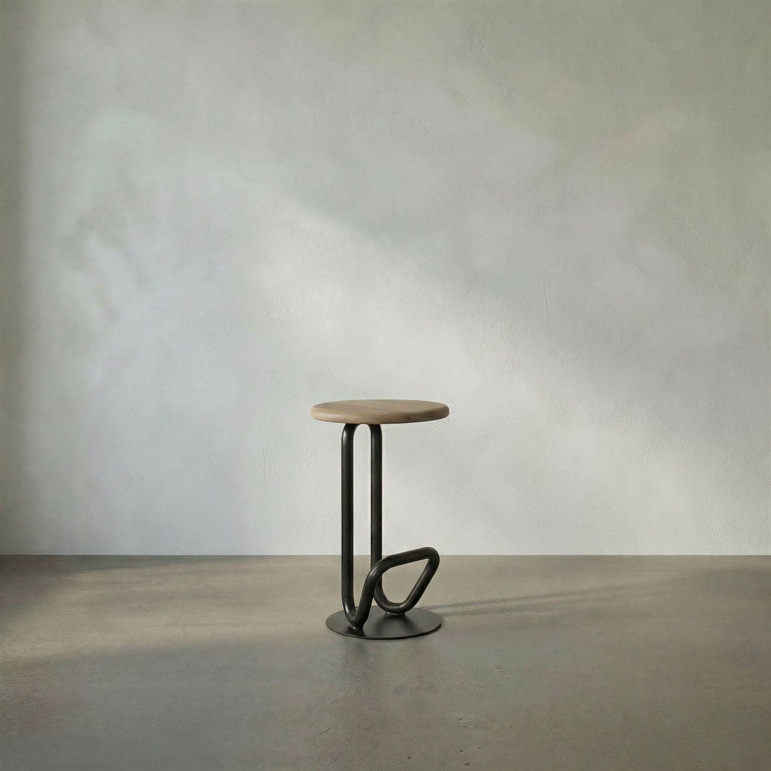 The Hook Bar Stool features a modern industrial style, combining matte black finished iron with natural white oak. Its robust design provides sleek urban seating that enhances bars and kitchens, offering timeless appeal.