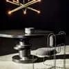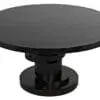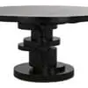 A round mahogany table with a Hand-Rubbed Black finish and a stacked geometric disc base. This piece combines traditional craftsmanship with modern design, making it perfect for contemporary, transitional, and industrial dining spaces.