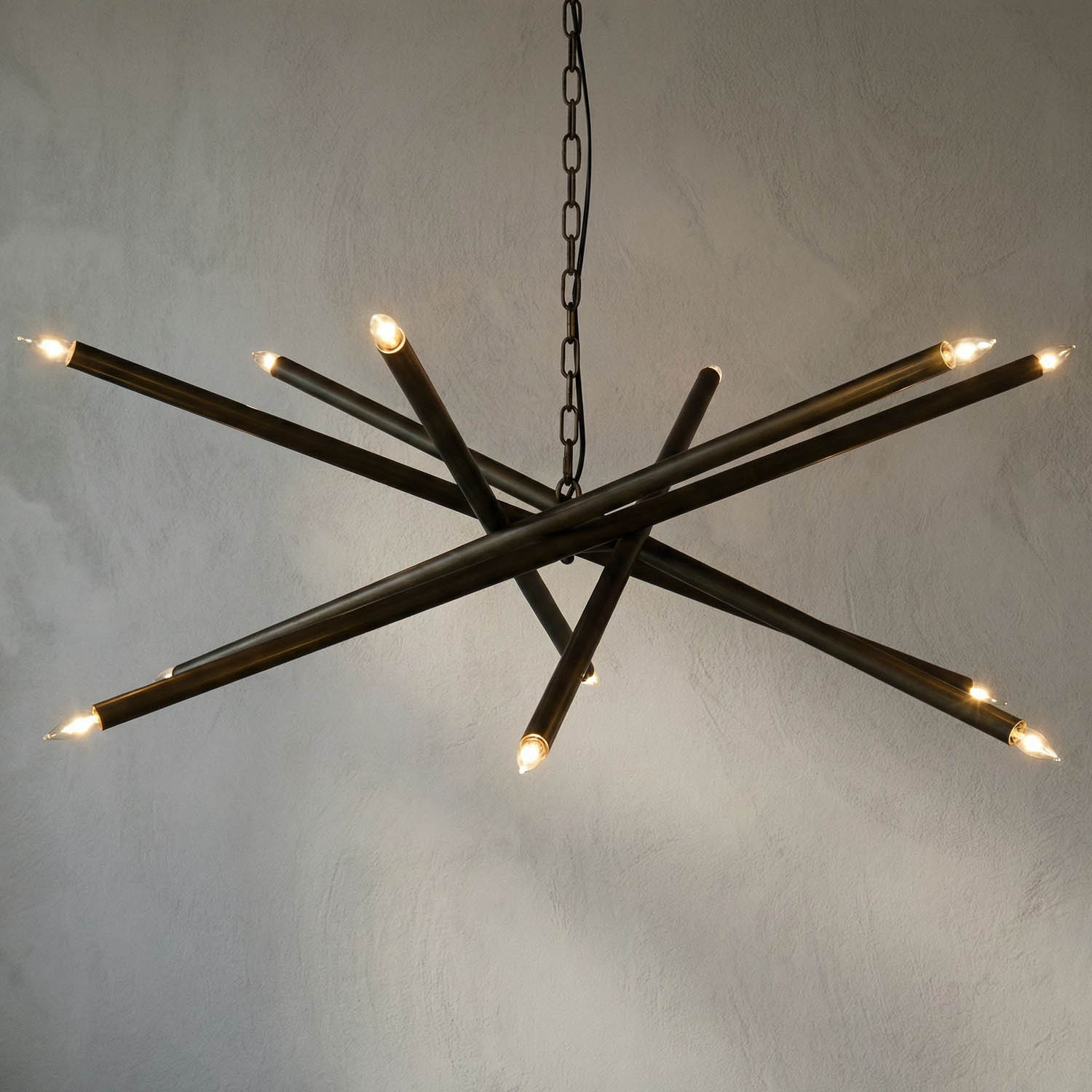The oversized Ikram Chandelier features a starburst of twelve antique brass arms with exposed bulbs, blending geometric precision and industrial style.