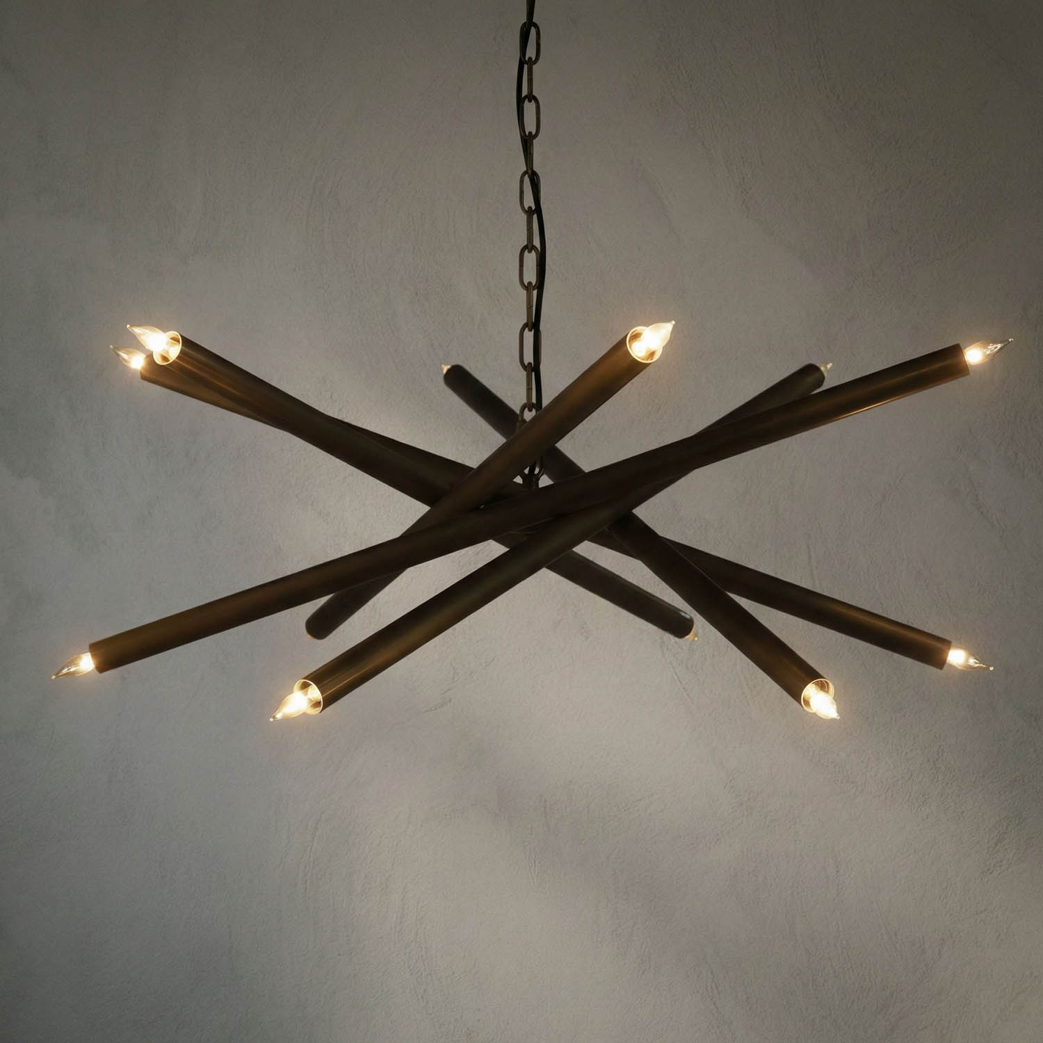 The Ikram Chandelier features a starburst of twelve antique brass arms with exposed bulbs, blending geometric precision and industrial style.
