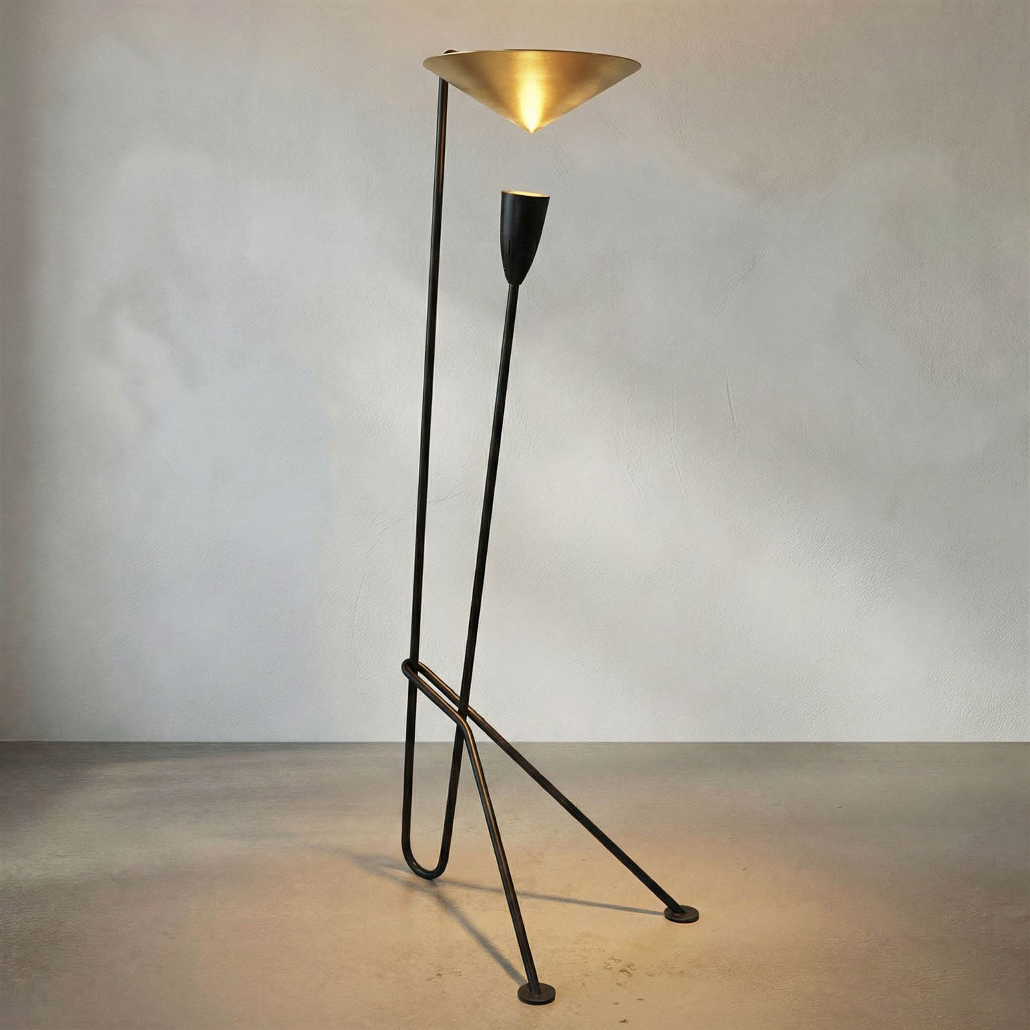 The Jetset floor lamp pairs a tall matte black tripod base with a flared, reflective brass shade. Angled downward over a textured cylinder, it blends mid-century geometry with industrial edge and retro-futuristic flair.