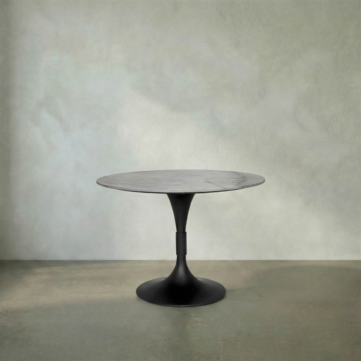 The Jman Table features a 36_ round Bianco Crown marble top positioned on a slender Matte-Black base. Elegant and compact, it combines refined materials with a sculptural form, making it ideal as a space-saver for intimate dining or a sophisticated accent.