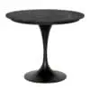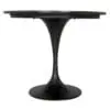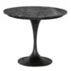 The Joni Table features a 36-inch round Night Snow marble top on a sculptural Matte-Black iron base, accented with subtle ribbing. This design merges bold craftsmanship with elegant minimalism, offering refined and compact appeal.