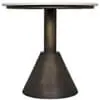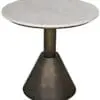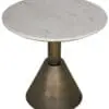 A round sculptural bistro or side table featuring a white marble top and a generously proportioned conical Aged Brass pedestal; it balances bold geometry with refined materials, evoking a sense of modern luxury and architectural minimalism.