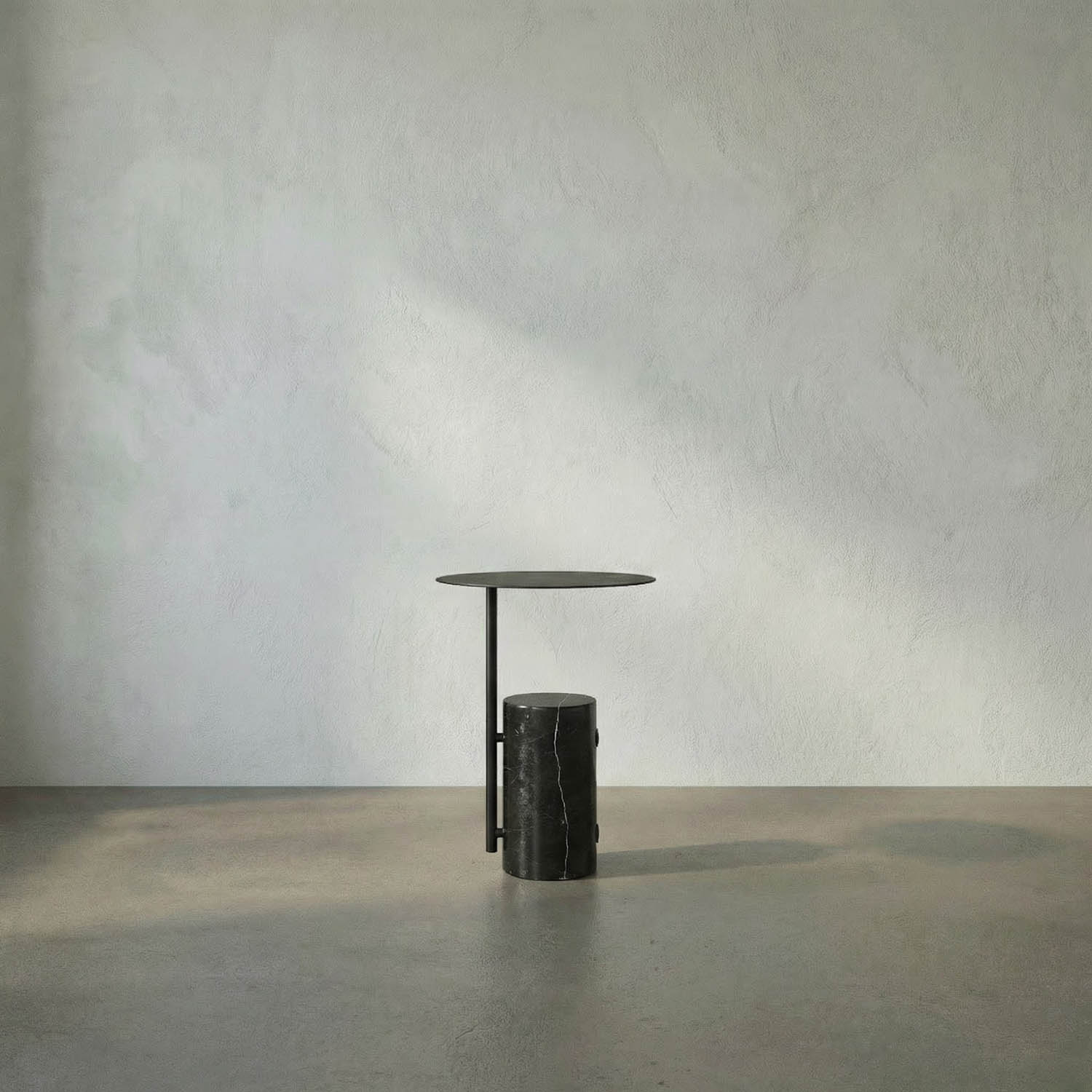 With industrial minimalism and mid-century restraint, this round side table features a side-mounted Matte-Black iron top and stem and a rich black marble base, creating a balanced and refined composition that is both architectural and tactile.