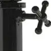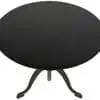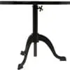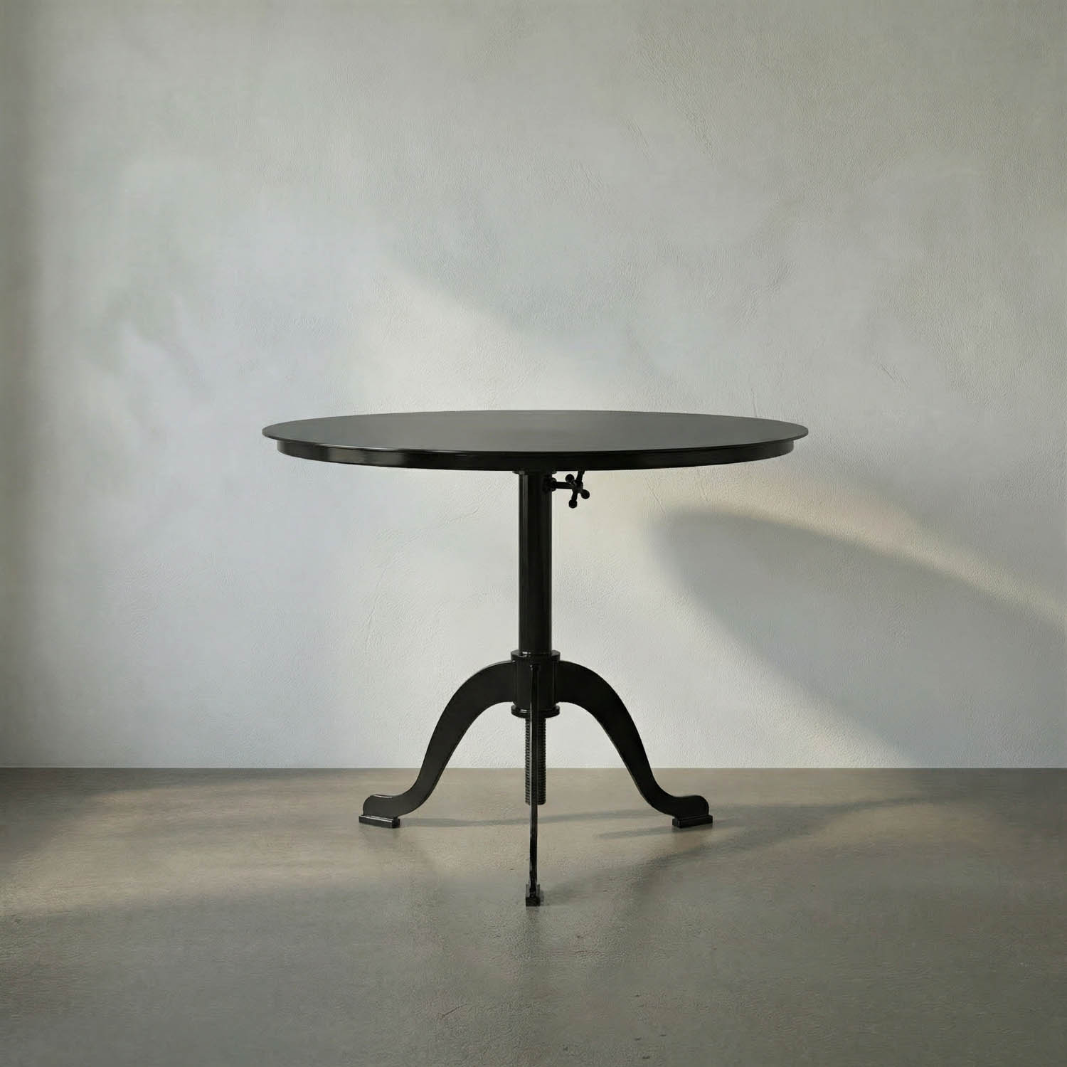 The round Kaldera Side Table is an industrial-style piece with a Matte Black iron tripod base and a unique adjustable crank, allowing height changes between 23″ and 29″. Its clean design blends function with sculptural appeal.