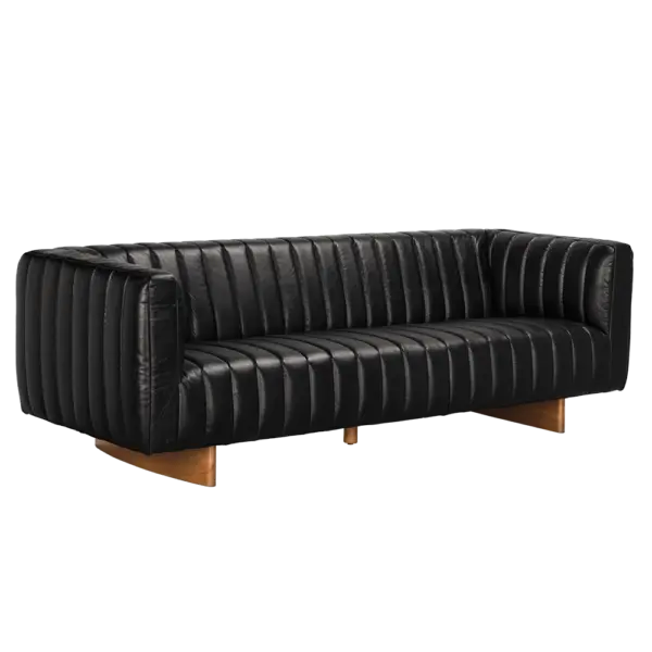 This modern tuxedo sofa in black leather features a dark walnut sled-leg that subtly elevates the channeled upholstery. The leg design adds visual lightness and enhances the tailored silhouette.