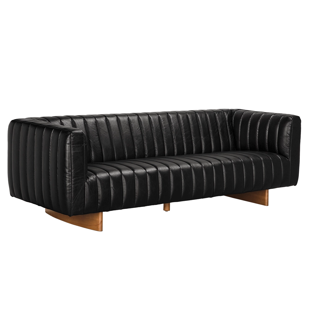 This modern tuxedo sofa in black leather features a dark walnut sled-leg that subtly elevates the channeled upholstery. The leg design adds visual lightness and enhances the tailored silhouette.