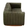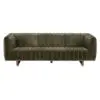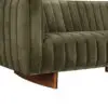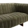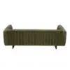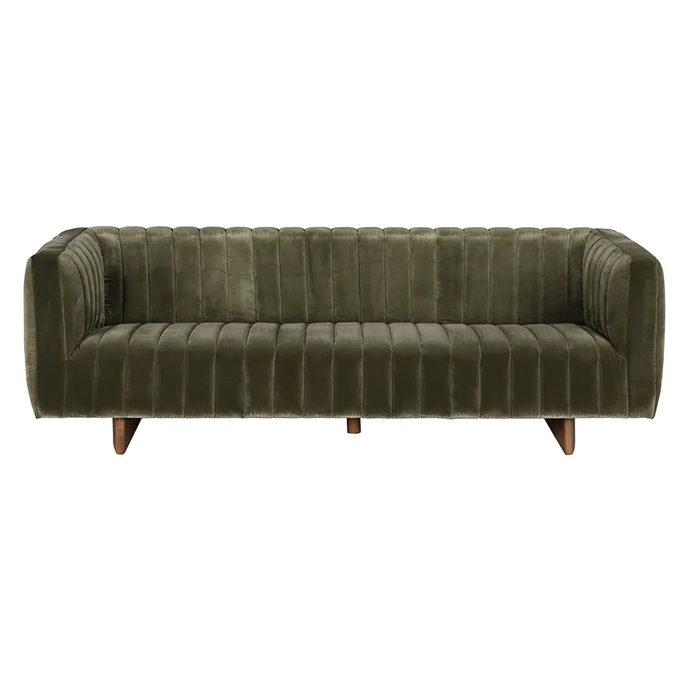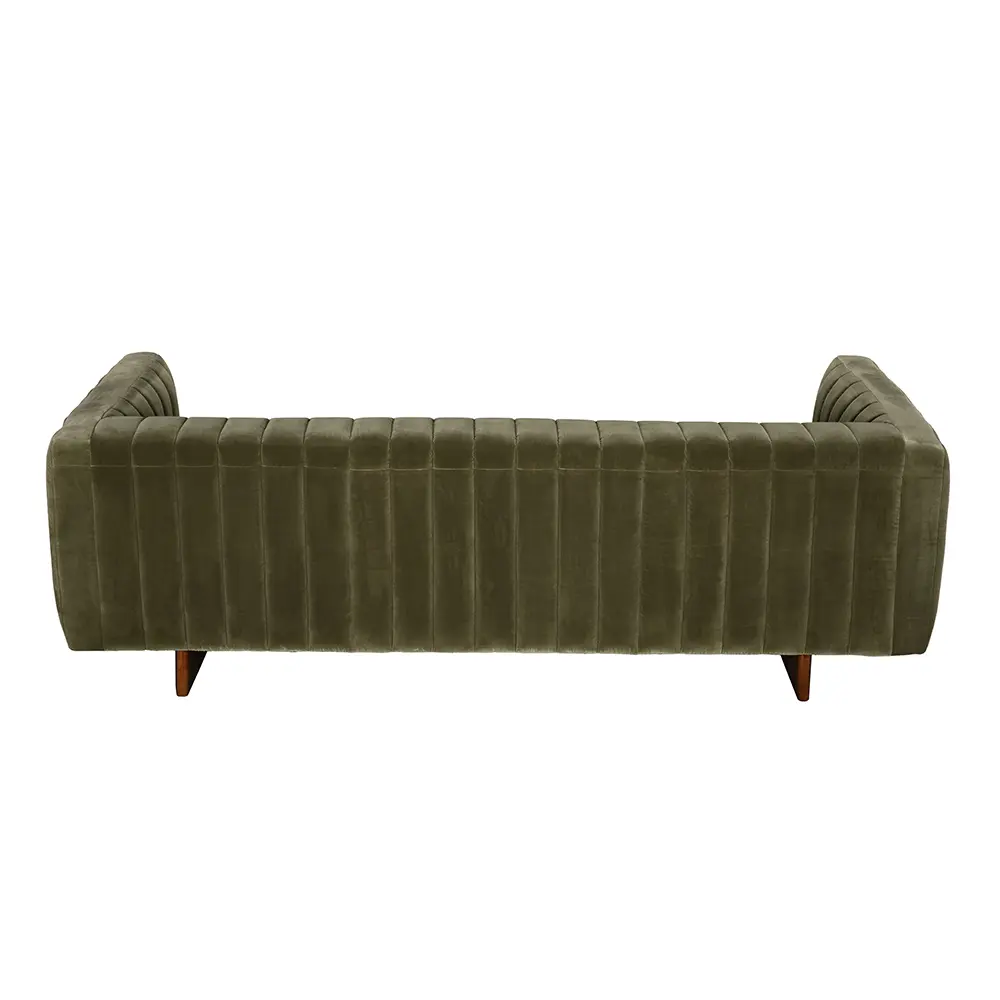 This modern tuxedo sofa in green performance velvet features a dark walnut sled-leg that subtly elevates the channeled upholstery. The leg design adds visual lightness and enhances the tailored silhouette.