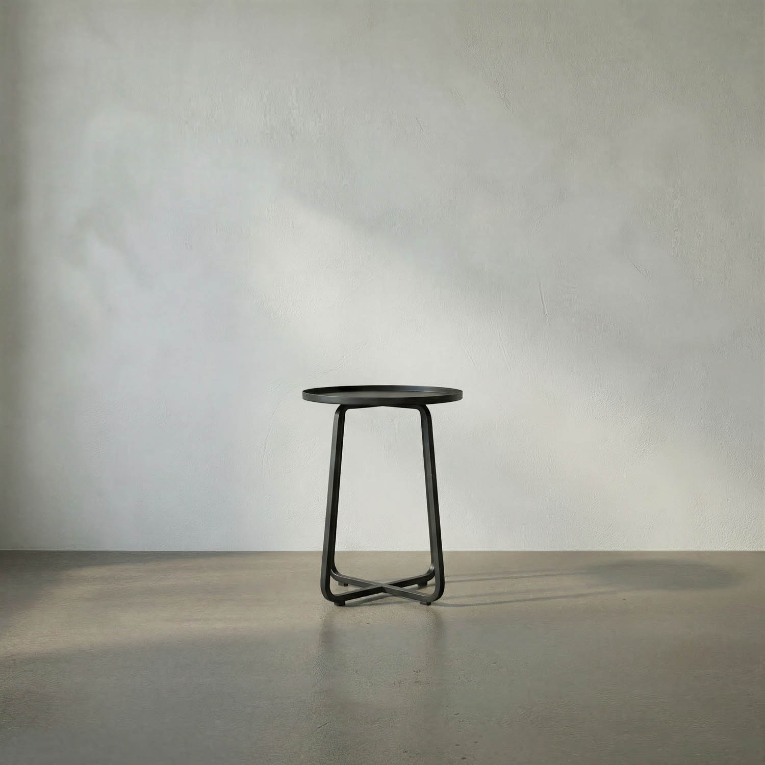 Four slender matte black iron legs hold this round tray-style top side table. Its minimalist and industrial design, along with compact proportions, make it a versatile accent piece.