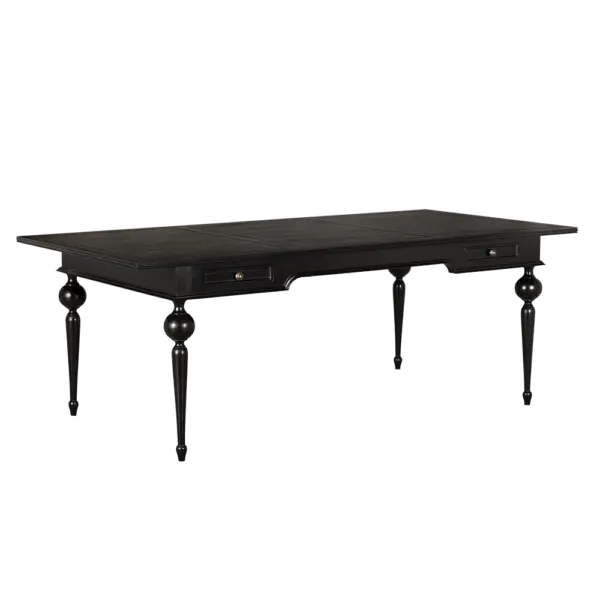 This Hand-Rubbed Black partner’s desk features a classic design with turned legs, inset drawers with brass pulls, and a spacious worktop. Its vintage silhouette offers both sophistication and a functional workspace for two.