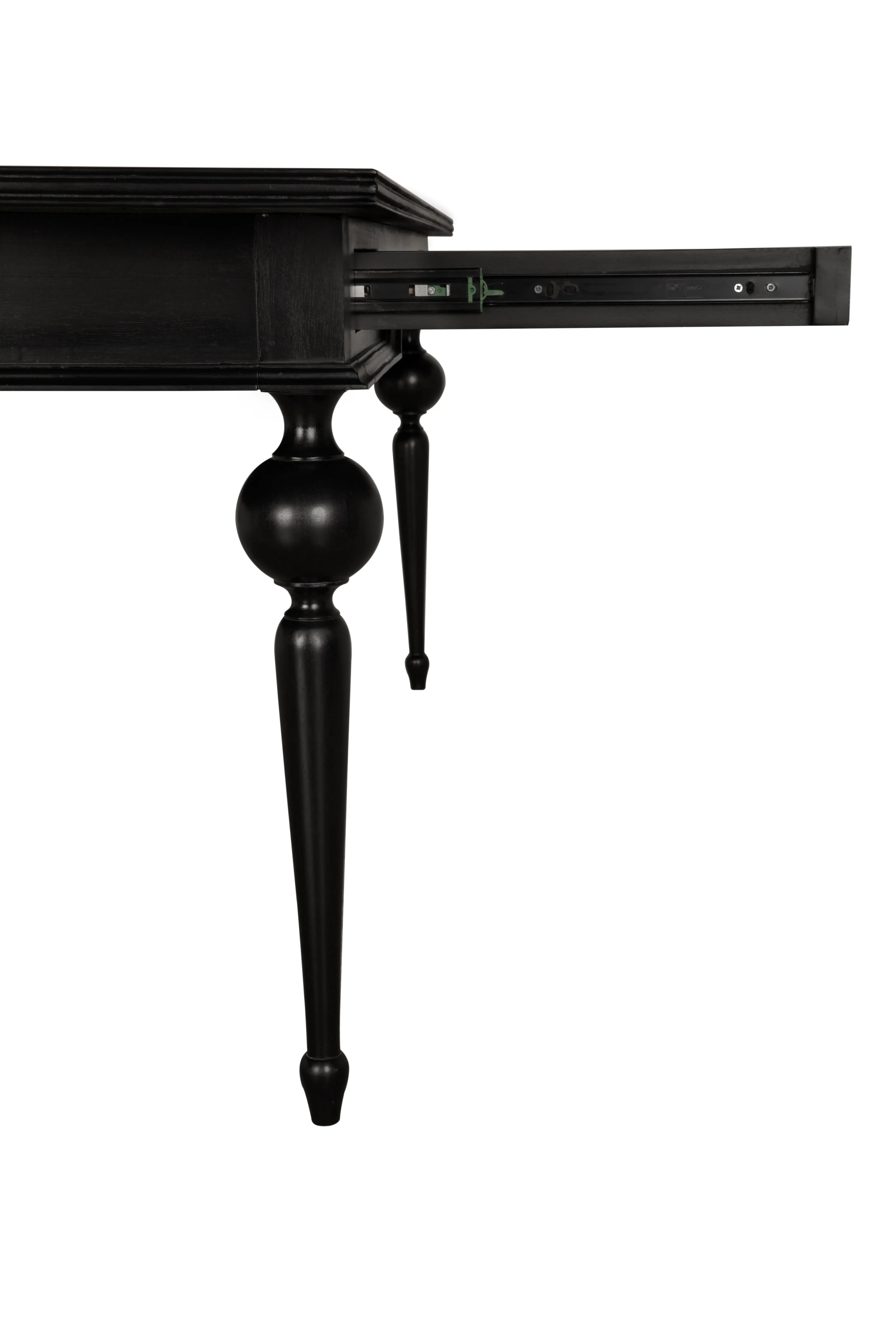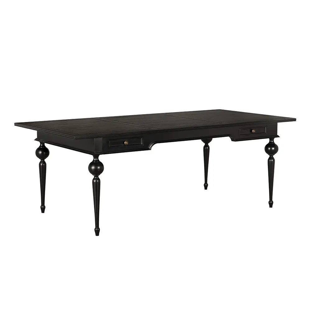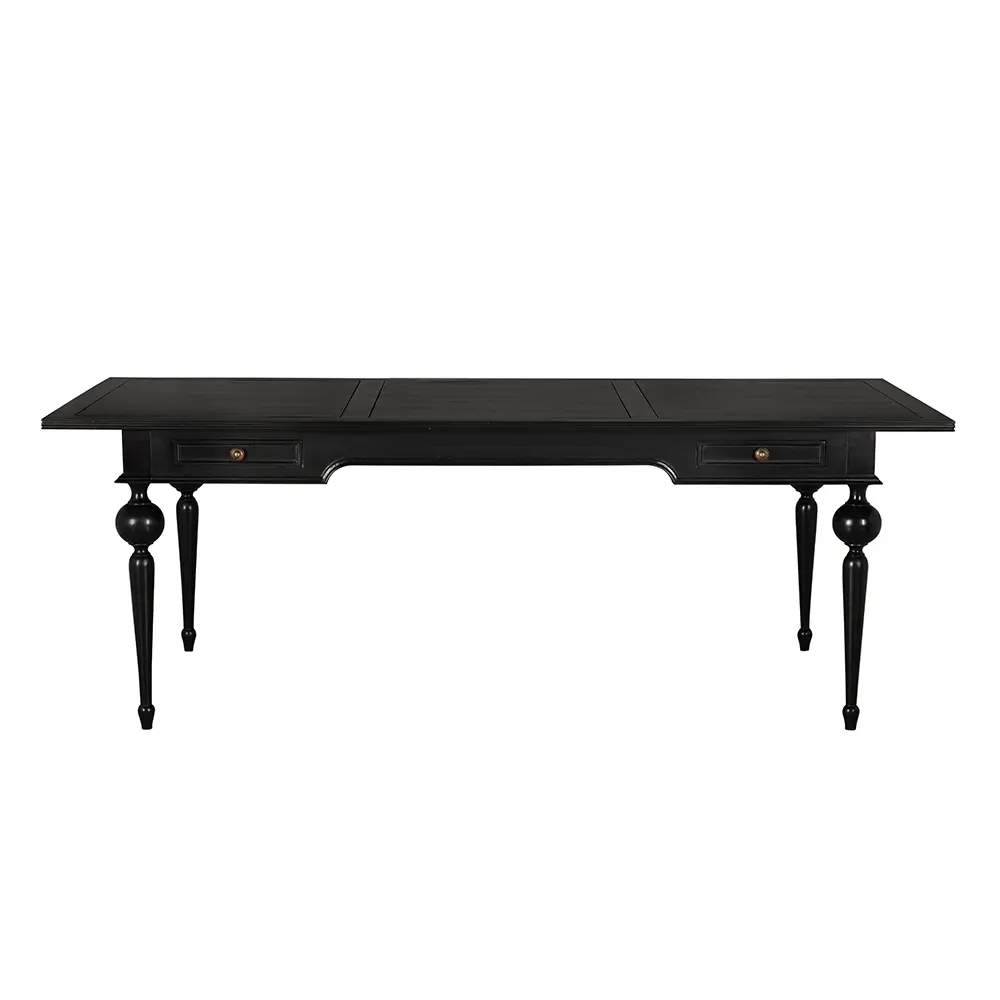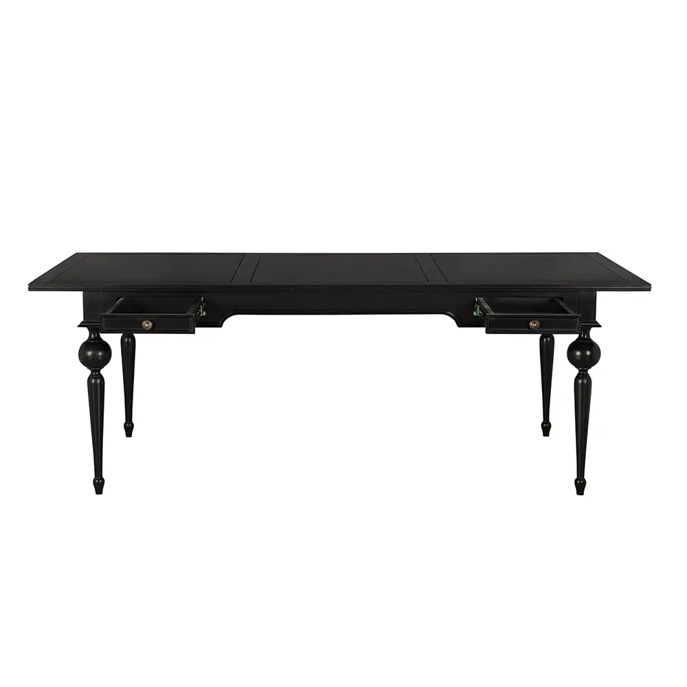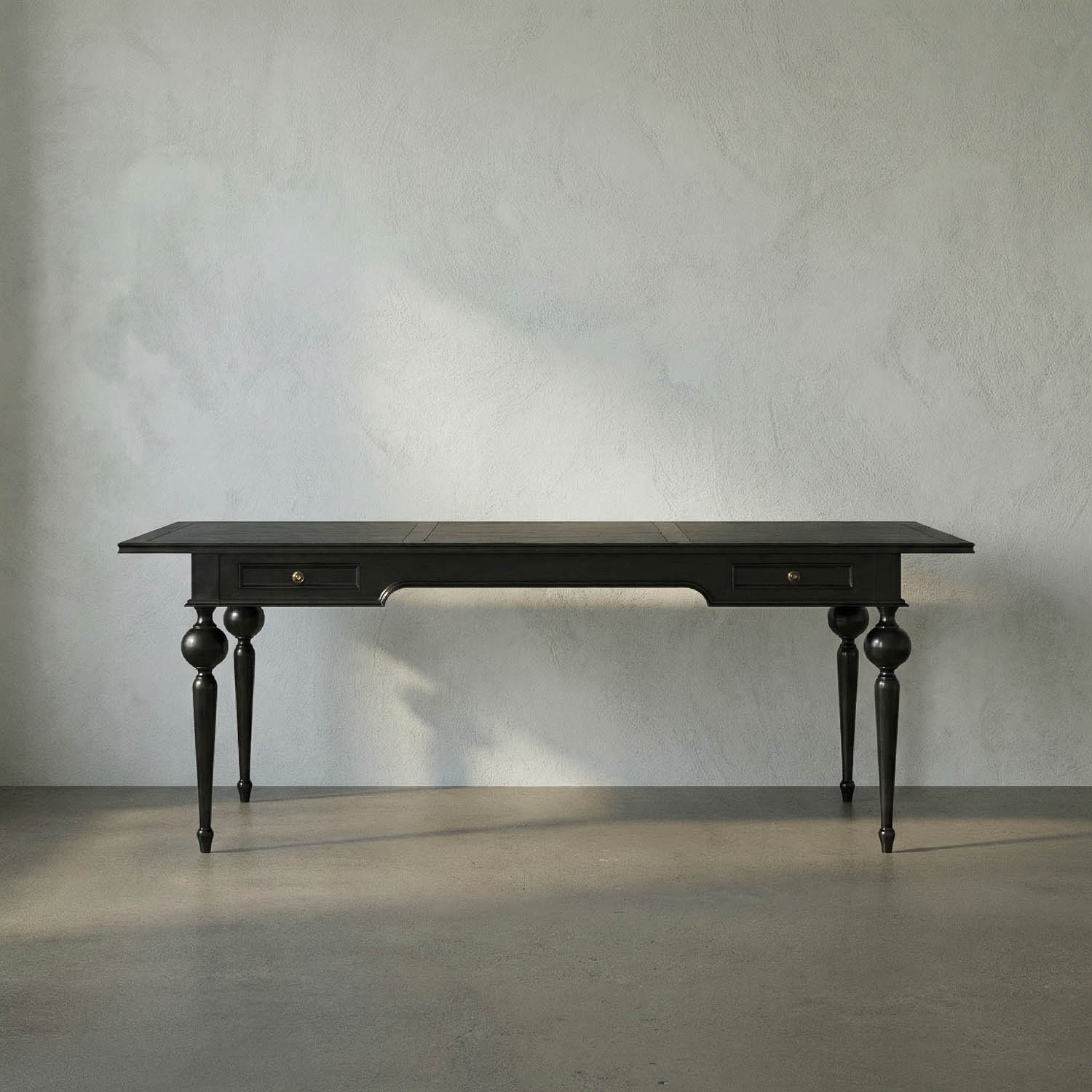 This Hand-Rubbed Black partner’s desk features a classic design with turned legs, inset drawers with brass pulls, and a spacious worktop. Its vintage silhouette offers both sophistication and a functional workspace for two.