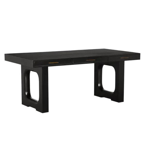 This three-drawer, modern Hand-Rubbed Black partners desk features a thick top, sleek drawers with linear pulls, and bold U-shaped bases. Its sculptural silhouette beautifully blends brutalist and Art Deco influences.