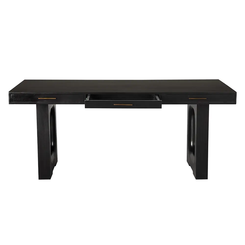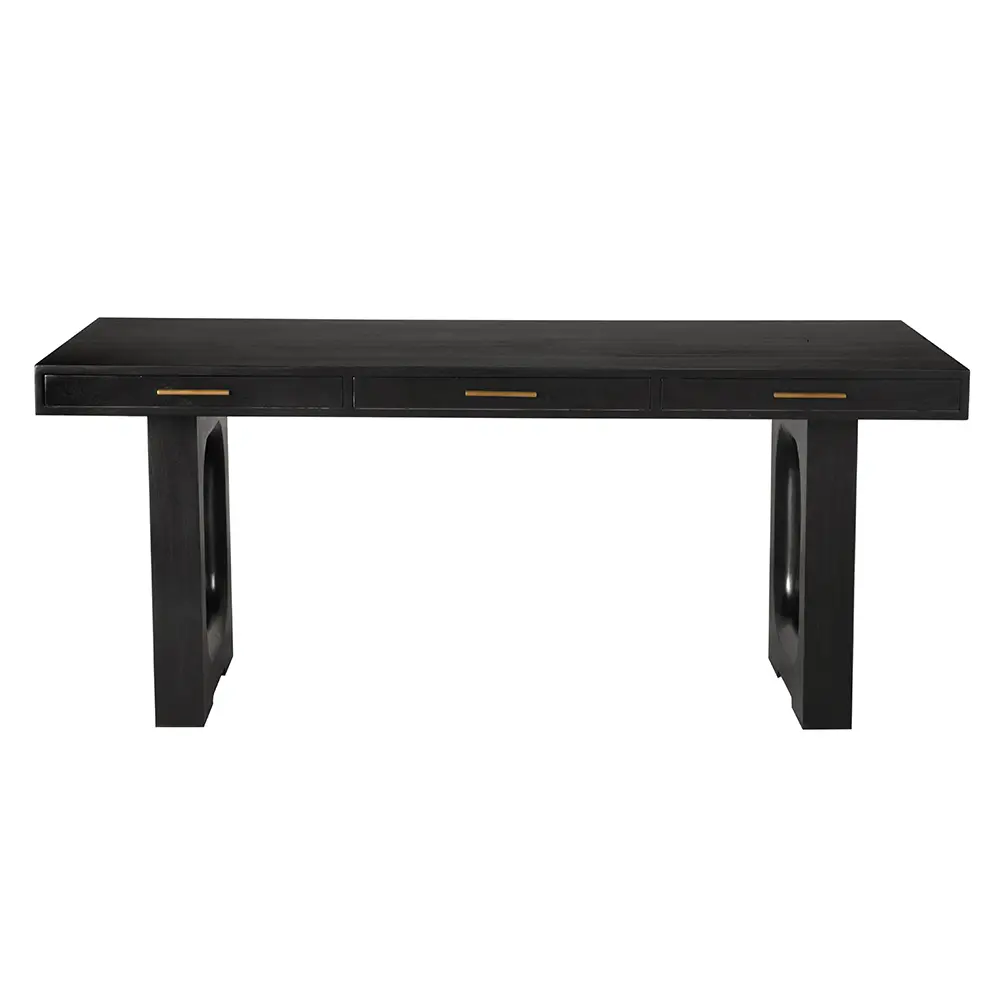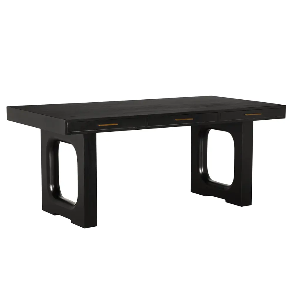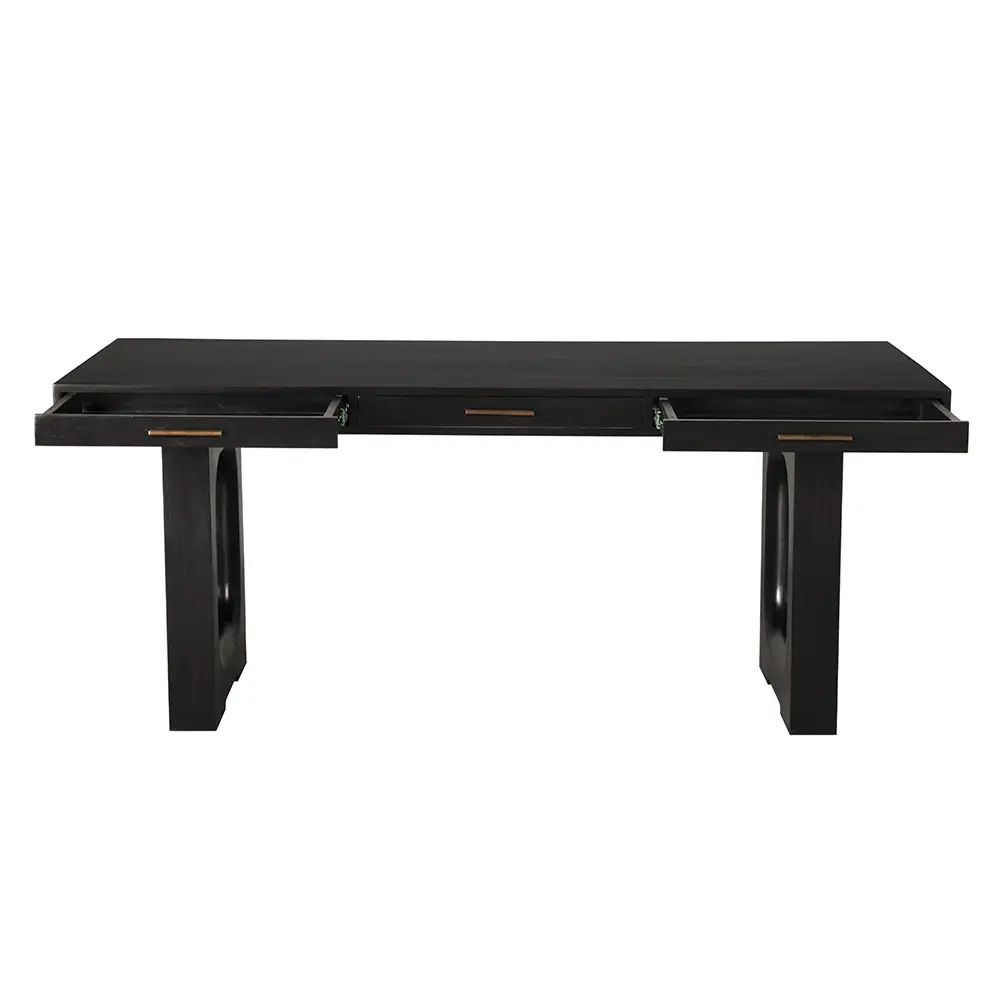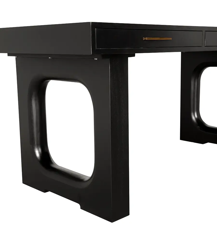 This three-drawer, modern Hand-Rubbed Black partners desk features a thick top, sleek drawers with linear pulls, and bold U-shaped bases. Its sculptural silhouette beautifully blends brutalist and Art Deco influences.
