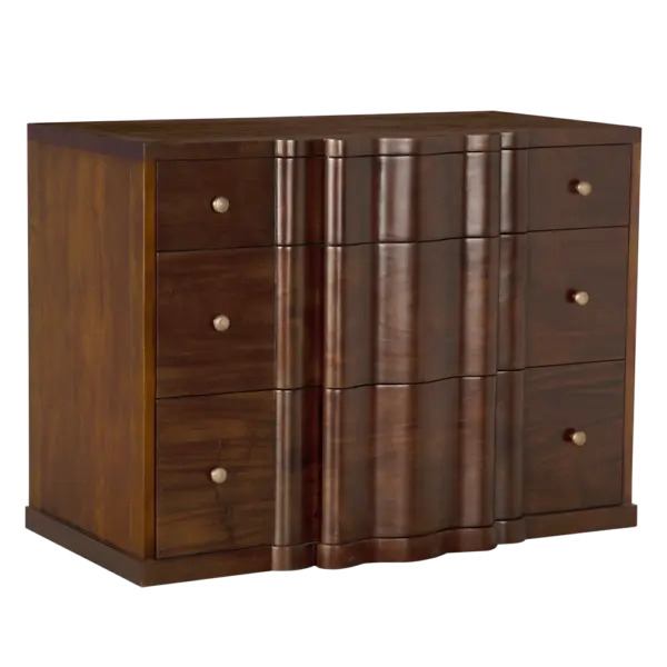 This three-drawer dresser features a sculpted wave-front design in a warm hand-rubbed brown finish, with integrated carved pulls and brass knobs. Its fluid silhouette and rich grain detail blend classic craftsmanship with contemporary expression.
