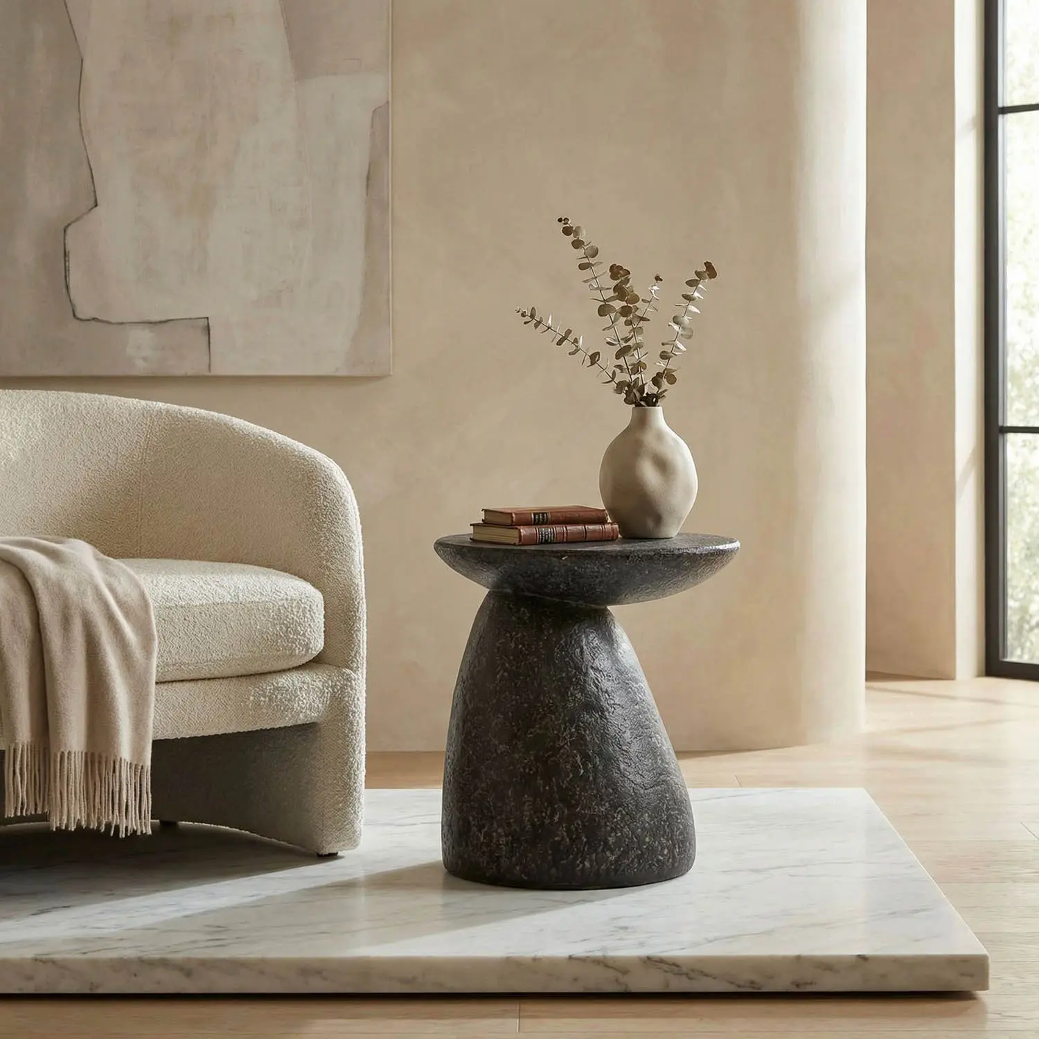 Like two balanced stones in a garden, the Kurokawa Side Table is inspired by natural rock formations and is handmade from fiber cement and finished in a stippled black finish. Indoor use only.