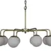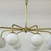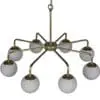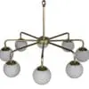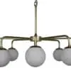 An Antique Brass mid-century modern-inspired chandelier in antique brass, with six gracefully curved arms holding frosted glass globes. Its sculptural silhouette and soft ambient glow create a striking architectural focal point in contemporary or transitional interiors.