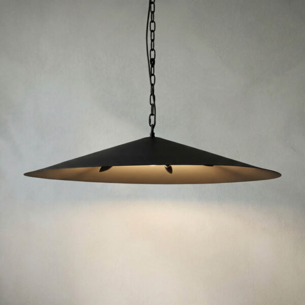 The oversized Lark Pendant is a wide, shallow dome light fixture made of matte black iron. Its minimalist design provides broad illumination, perfect for modern dining rooms, kitchens, or entryways.