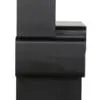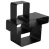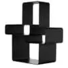 The Latisia Shelf is a sculptural, geometric shelving unit made from matte black iron. Its interlocking, stacked design creates four open compartments. Bold and minimalist, it serves as a striking bookshelf.