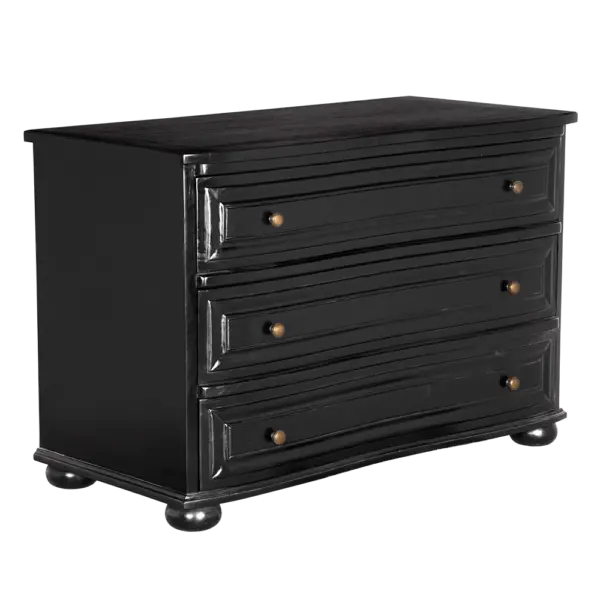 This three-drawer hand-rubbed black chest features sculpted, flowing drawer fronts, a hand-rubbed finish, and round solid brass knobs. Resting on bun feet, it blends modern elegance with traditional craftsmanship for a bold, artistic statement.