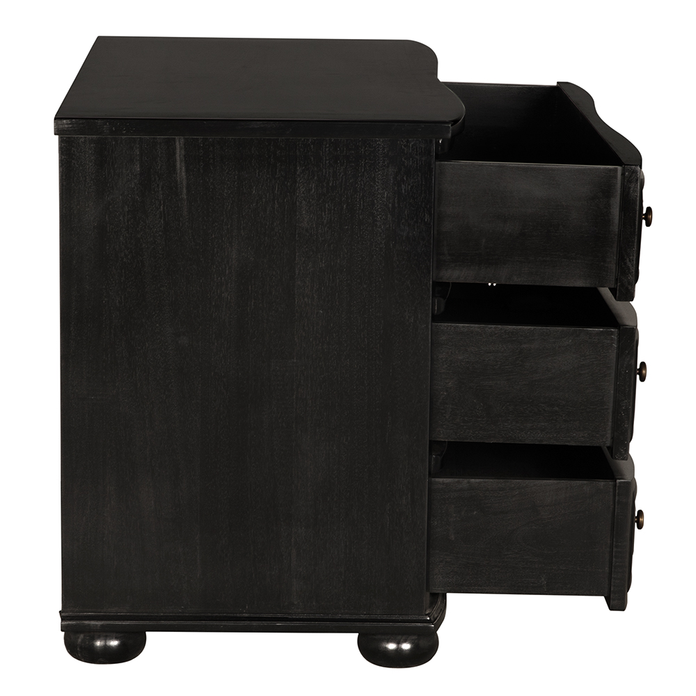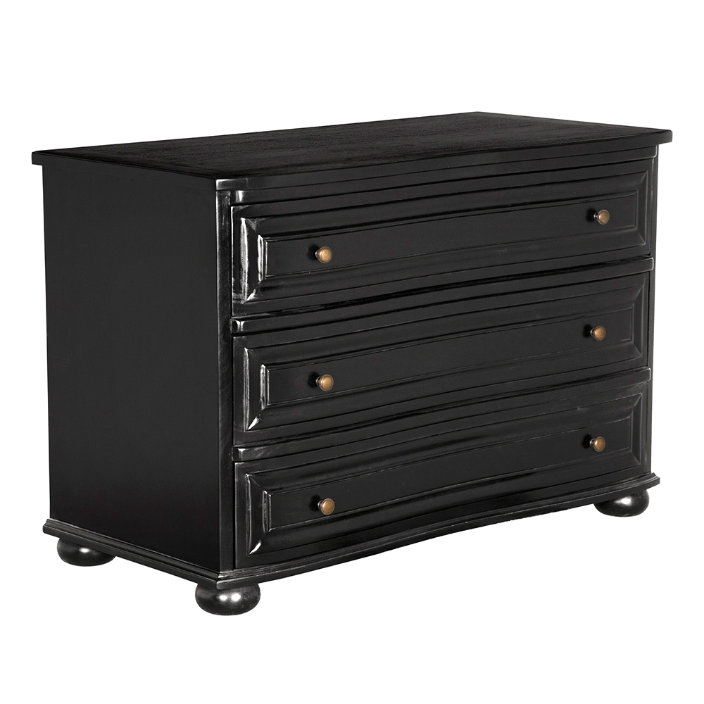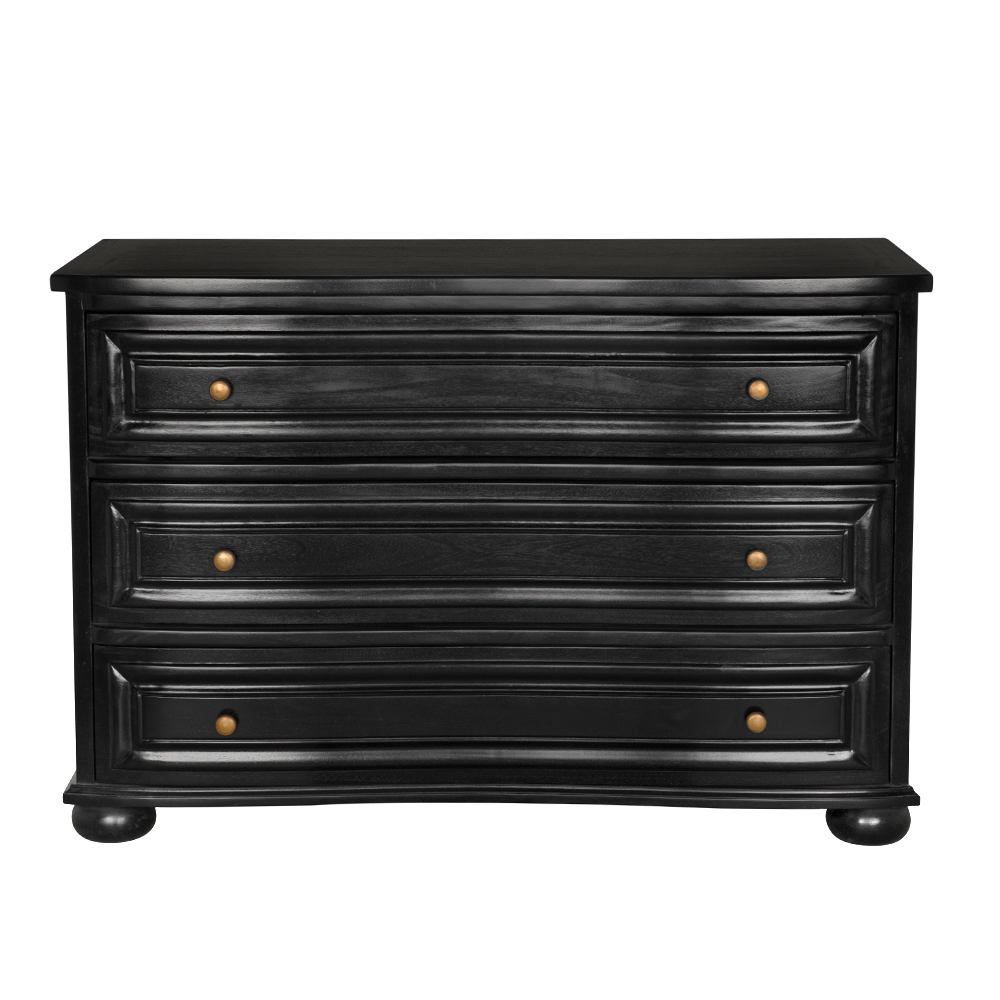 This three-drawer hand-rubbed black chest features sculpted, flowing drawer fronts, a hand-rubbed finish, and round solid brass knobs. Resting on bun feet, it blends modern elegance with traditional craftsmanship for a bold, artistic statement.