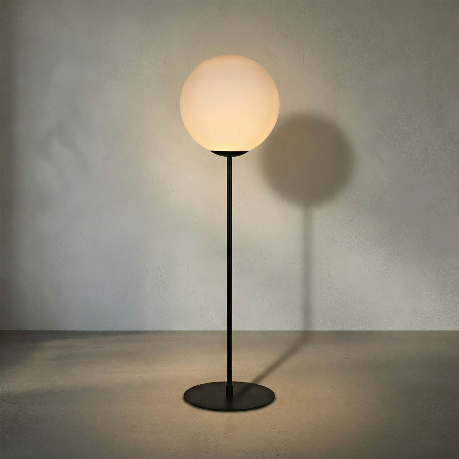 A tall, minimalist floor lamp with a matte black stem and an oversized 16″ frosted glass globe, the Lazarus provides sculptural presence and ambient light–ideal for interiors seeking a bold, moonlit statement.