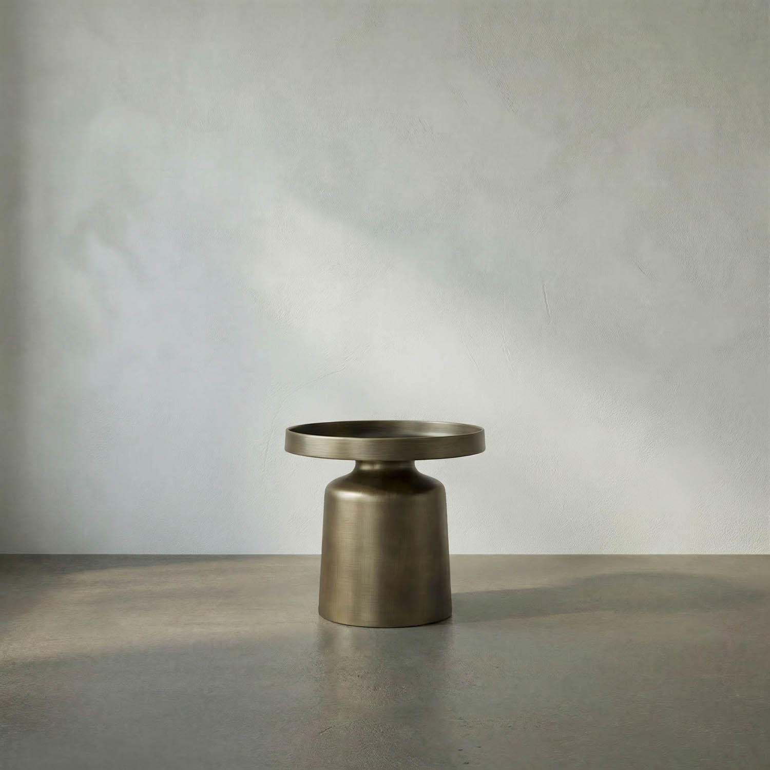 A small, round side table with a tray top and an elegantly shaped Aged Brass base, almost resembling a butter churn; it balances bold shapes with refined materials, evoking a sense of modern luxury and architectural minimalism.