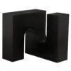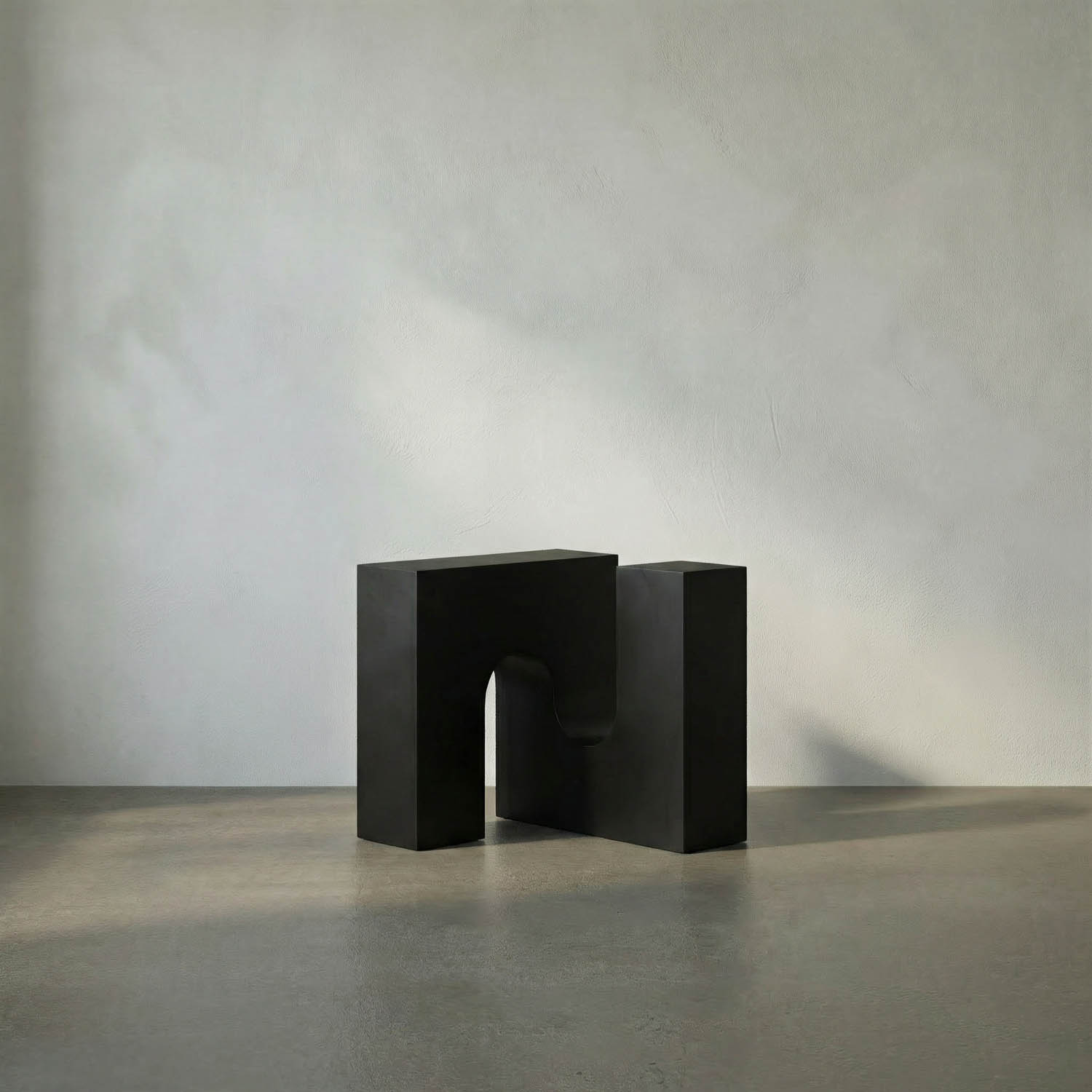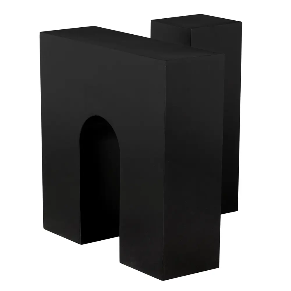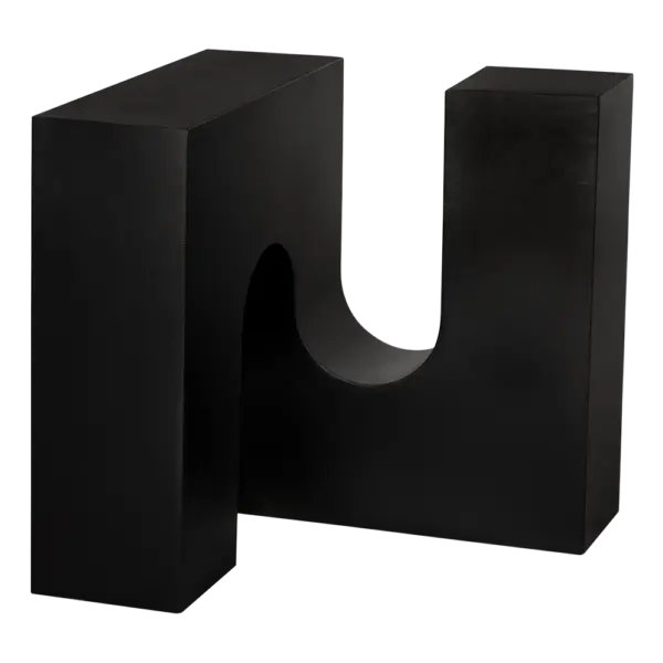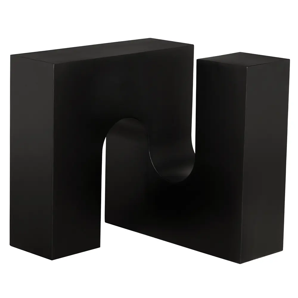 This black iron side table showcases a bold geometric silhouette with curved negative space, blending functionality and artistry. Its minimalist design makes it a striking statement piece for interiors seeking sculptural interest.