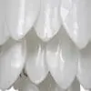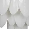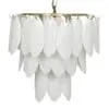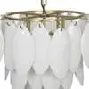 The three-tiered antique brass Lotus Chandelier features layered opaque glass petals resembling a blooming flower. Its organic, sculptural design emanates a soft glow.