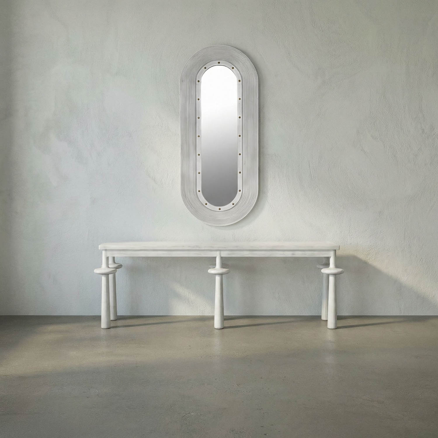 The Luna Mirror boasts an elongated racetrack-shaped mahogany frame with a whitewashed finish that highlights the natural wood grain. Antique brass hex dot accents provide subtle detail, resulting in a warm, refined focal point.