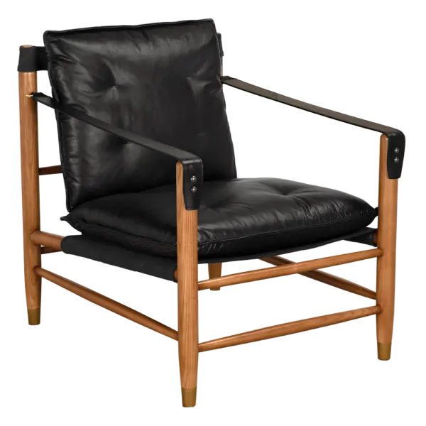 This chair features a Dark Walnut frame paired with Ebony Black leather and canvas details. Its clean lines and material contrast create a sophisticated, mid-century modern-inspired armchair.