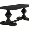 The Madeira Dining Table is made of mahogany and has a Hand-Rubbed Black finish. It features substantial turned legs and classic proportions, making it a timeless, stately centerpiece with artisanal presence suitable for traditional or transitional interiors.