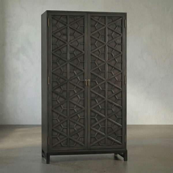 Standing at over eight feet tall, the Maharadscha Hutch showcases Pale-finished mahogany with subtle carvings and brass hardware set on a black base, merging grand scale with a refined, sculptural presence.