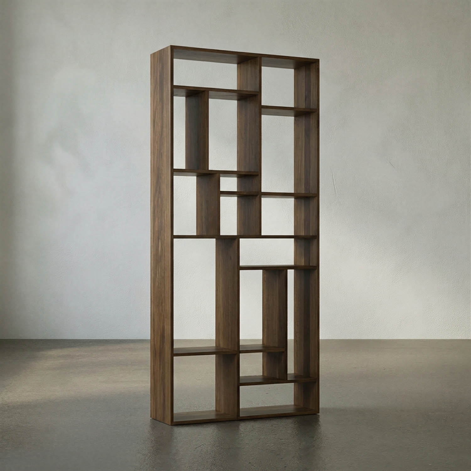 Beautifully finished walnut shelves and cubbies offer unique storage and display options in the striking Mondrian-inspired Malic bookshelf.