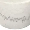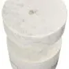 A Bianco Crown marble table with a stacked cylindrical form features smooth curves and distinctive natural veining, creating a minimalist sculptural accent that combines functionality with artistic design.