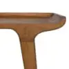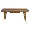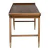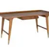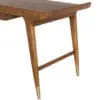 This teak desk features mid-century modern refinement with tapered legs, brass-capped feet, and a raised-edge tabletop. A sleek oval drawer provides functional storage, enhanced by warm wood tones and a refined silhouette.