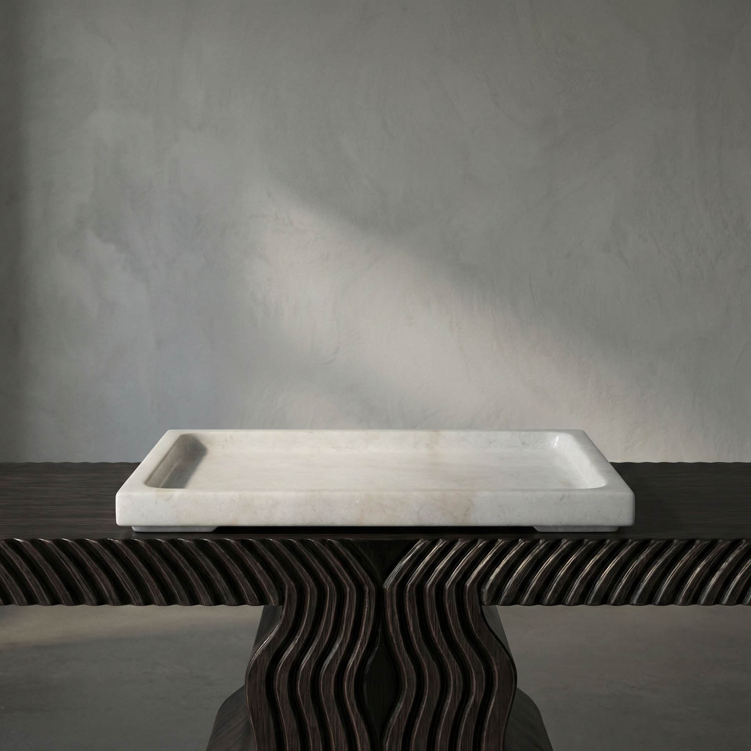 Carved from white marble, this contemporary rectangular tray features simple lines that allow the natural material to take center stage. Each is unique, as no two pieces of natural stone are identical.