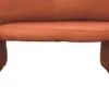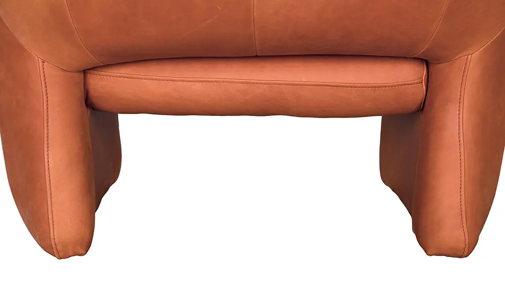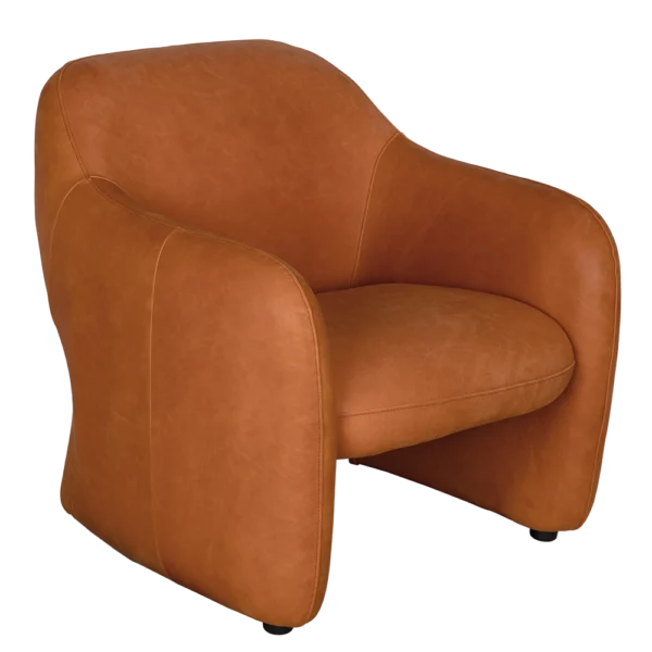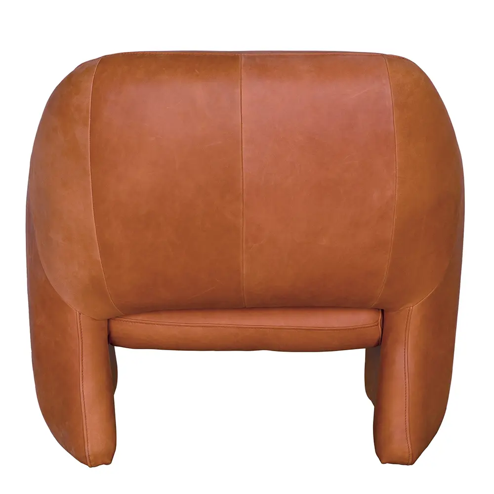 This armchair has a soft, sculptural silhouette with continuous curves, a low profile, and is upholstered in Roman Red leather. Its modern rounded form and minimalistic feet provide a cozy yet contemporary aesthetic.
