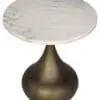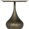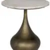 A small, round side table featuring a white marble top and an elegantly proportioned teardrop Aged Brass base; it balances bold shapes with refined materials, evoking a sense of modern luxury and architectural minimalism.