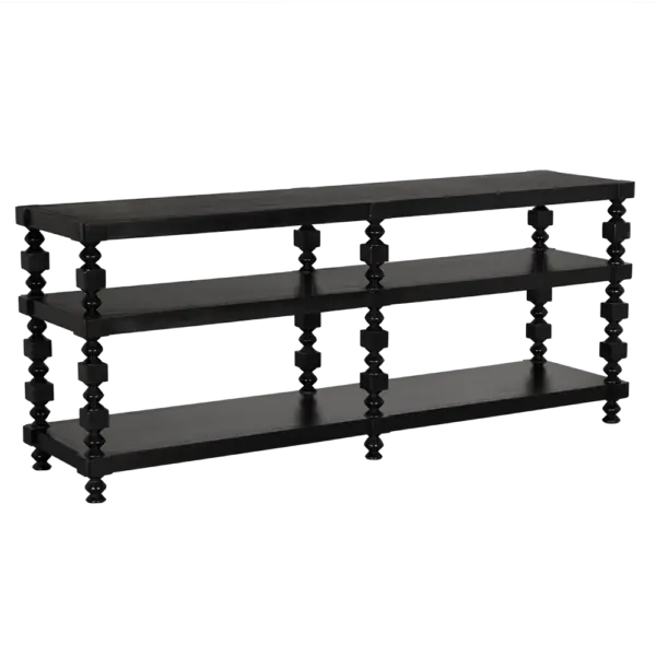 This three-tier console features sculptural spindle legs with alternating turned and faceted forms. Finished in Hand-Rubbed Black, it blends traditional detailing with modern minimalism, making it ideal for transitional interiors that require both decorative interest and open storage.