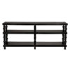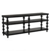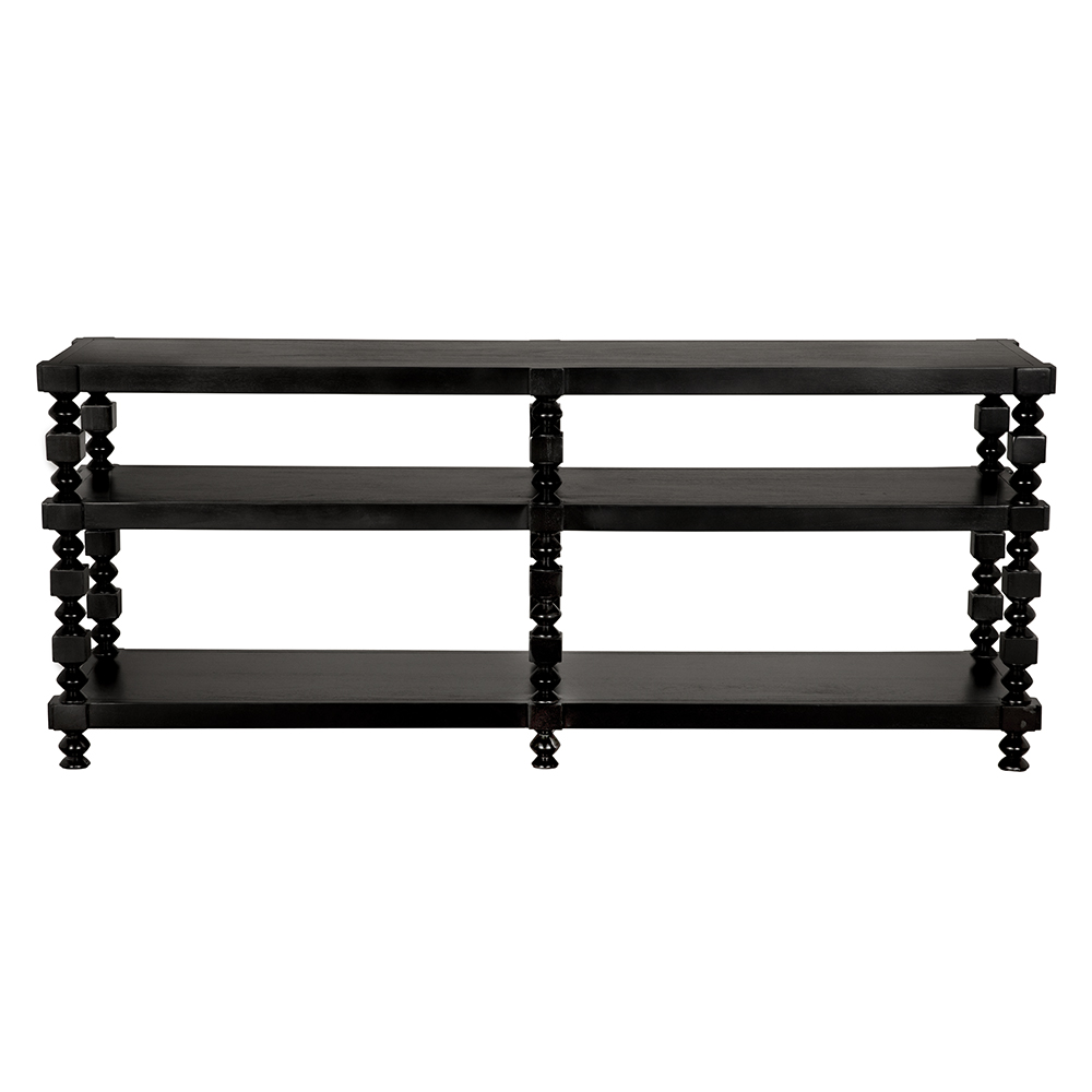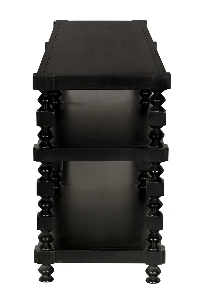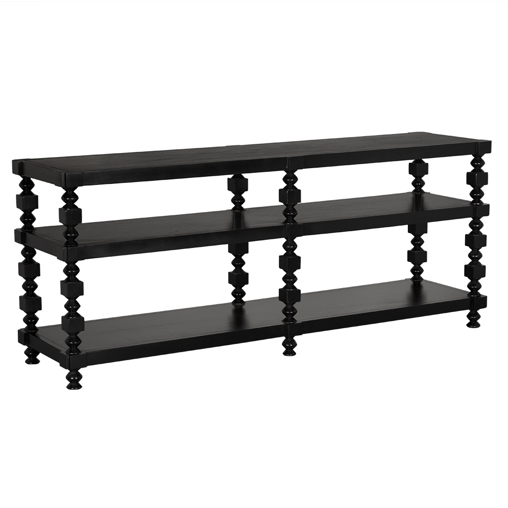 This three-tier console features sculptural spindle legs with alternating turned and faceted forms. Finished in Hand-Rubbed Black, it blends traditional detailing with modern minimalism, making it ideal for transitional interiors that require both decorative interest and open storage.