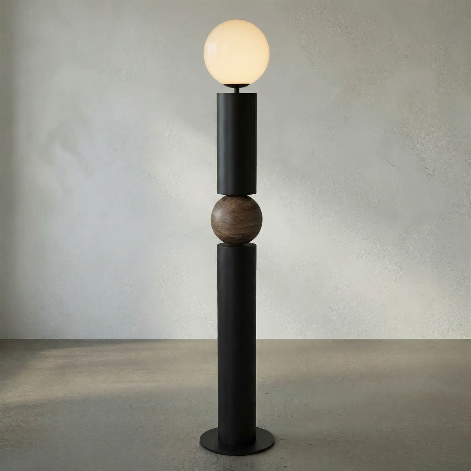 The Max Floor Lamp showcases a matte black iron frame paired with a decorative wooden orb and a frosted globe shade. Its tall, slim design provides soft, focused lighting and features an inline floor switch for convenient use.