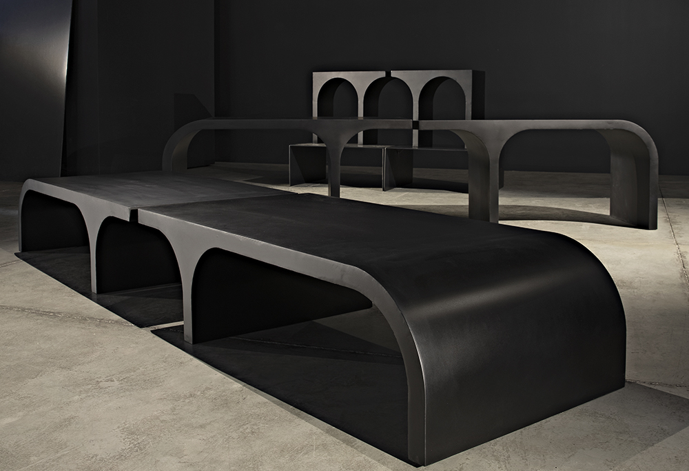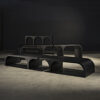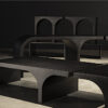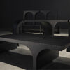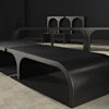 The Maximus Coffee Table in a Black Matte Finish showcases a beautiful updated version of a waterfall edge design, featuring a dramatic arch-shaped silhouette with an extended tabletop that creates a floating appearance.