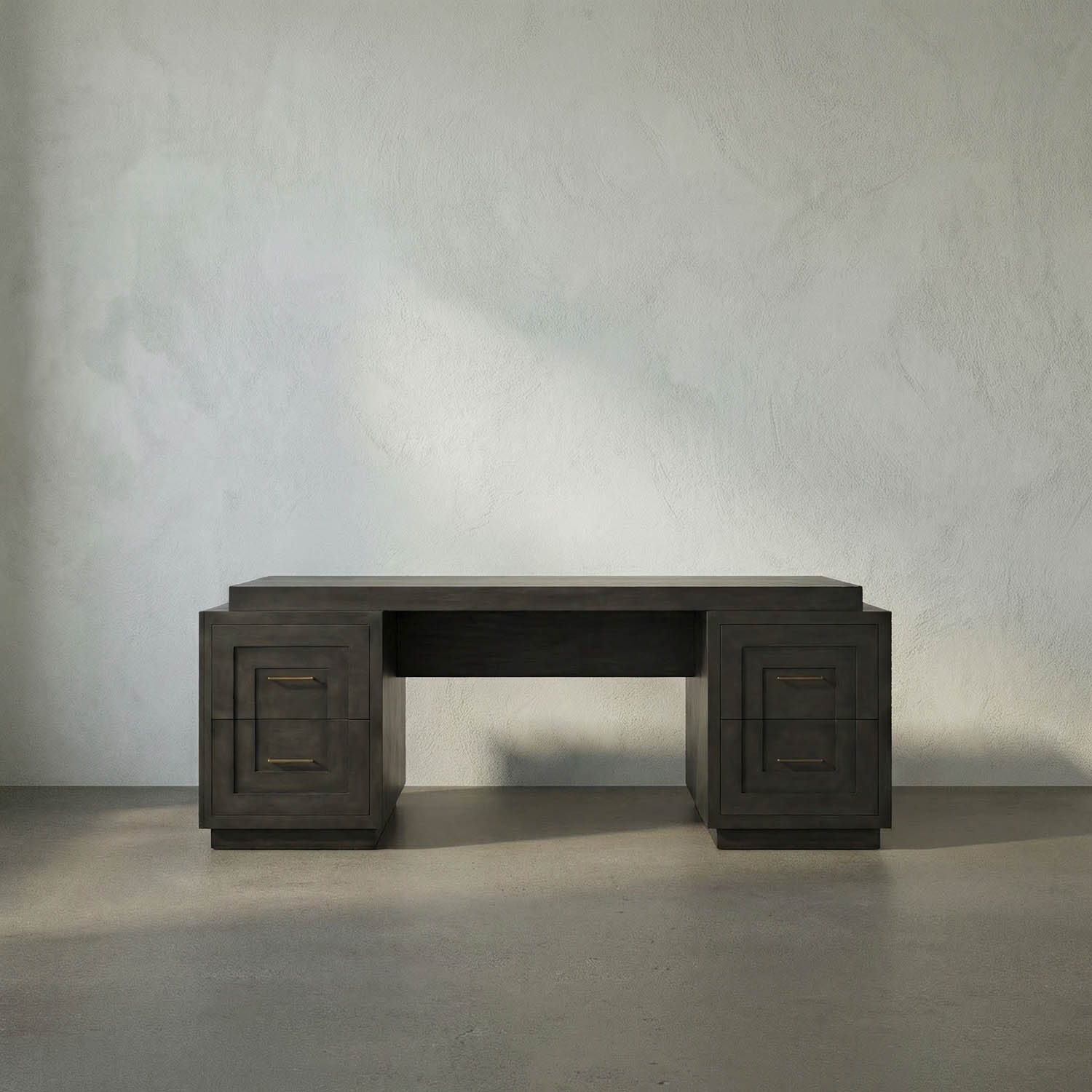 The Mentor Desk, crafted from mahogany, is a spacious partner’s desk that offers ample storage with four drawers per side. Its carved details, solid brass pulls, and clean lines combine traditional elegance with modern refinement.