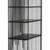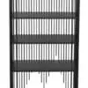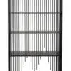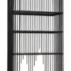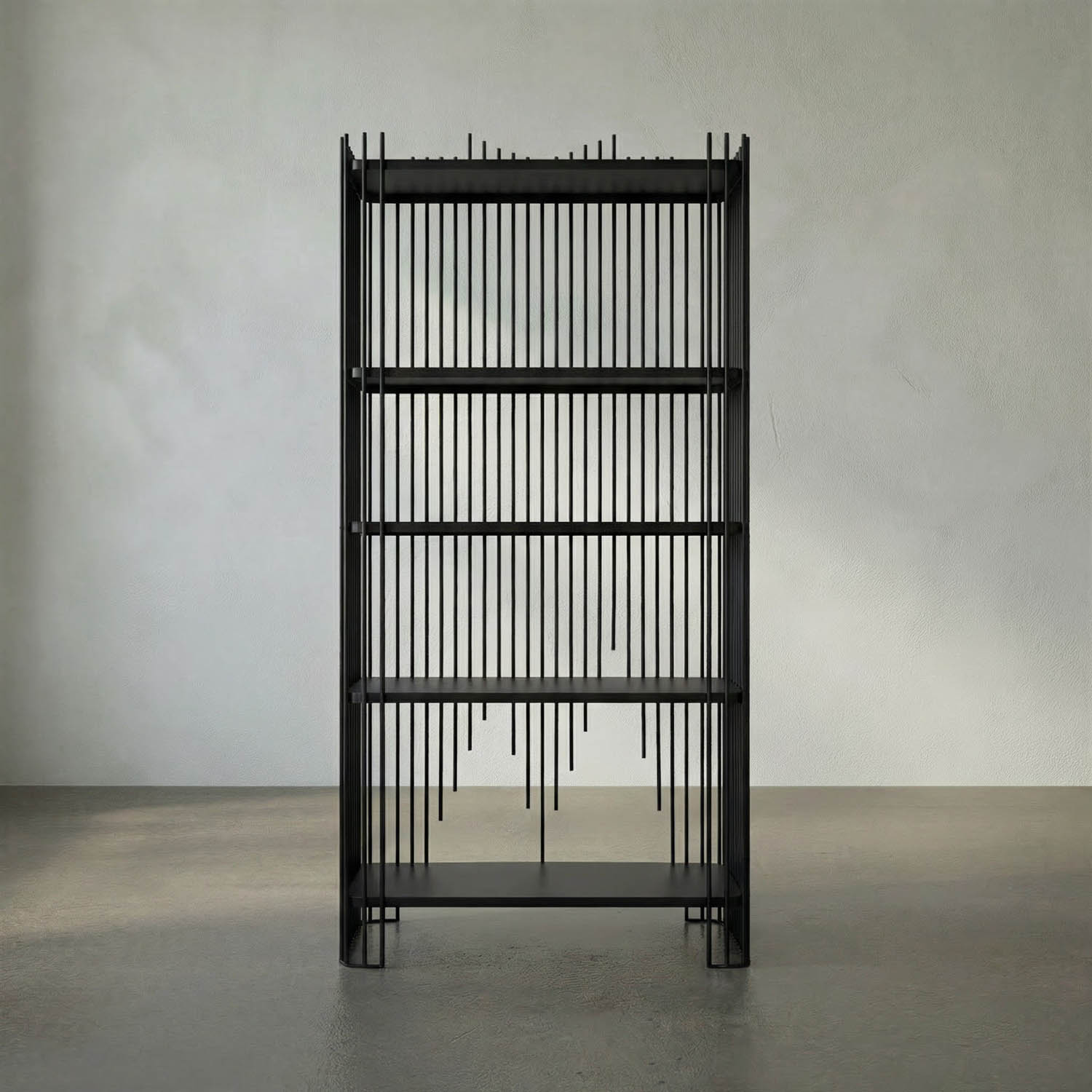The Mila Bookcase features sleek vertical rods in a matte black finish, creating a semi-transparent, cage-like frame that surrounds open shelves. The varied rod heights add rhythm and visual interest.