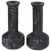 The Milos Candle Holder set features two hand-carved black marble pieces with rounded, organic silhouettes. Their smooth, taper-style holders and natural stone veining offer sculptural, understated elegance.