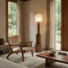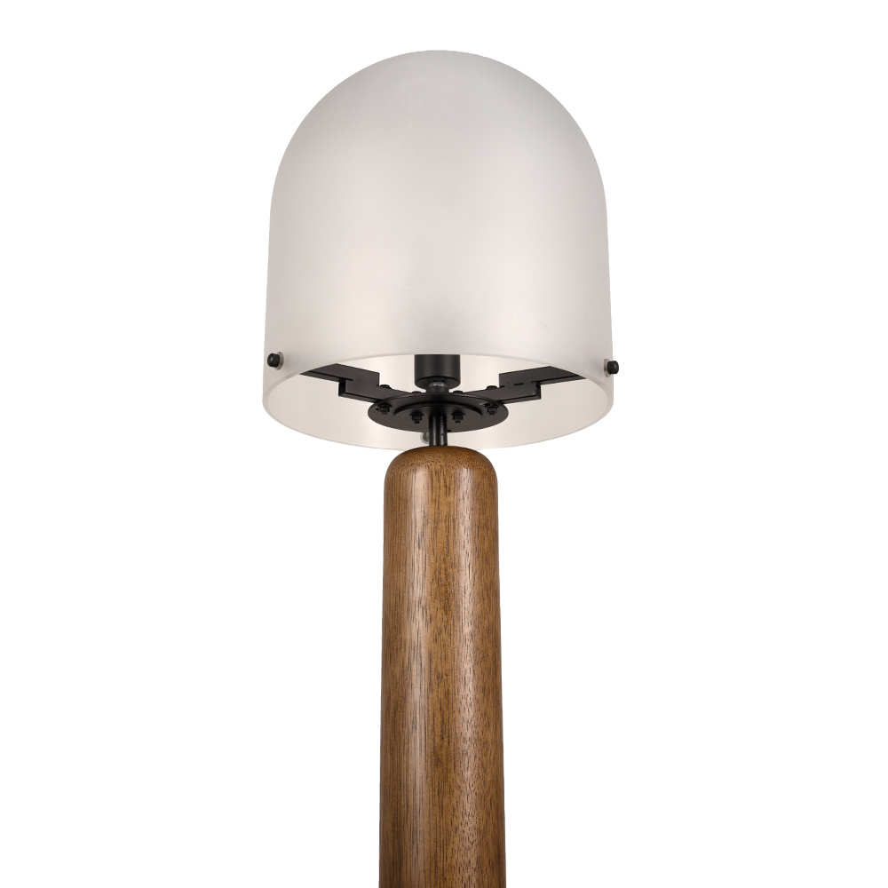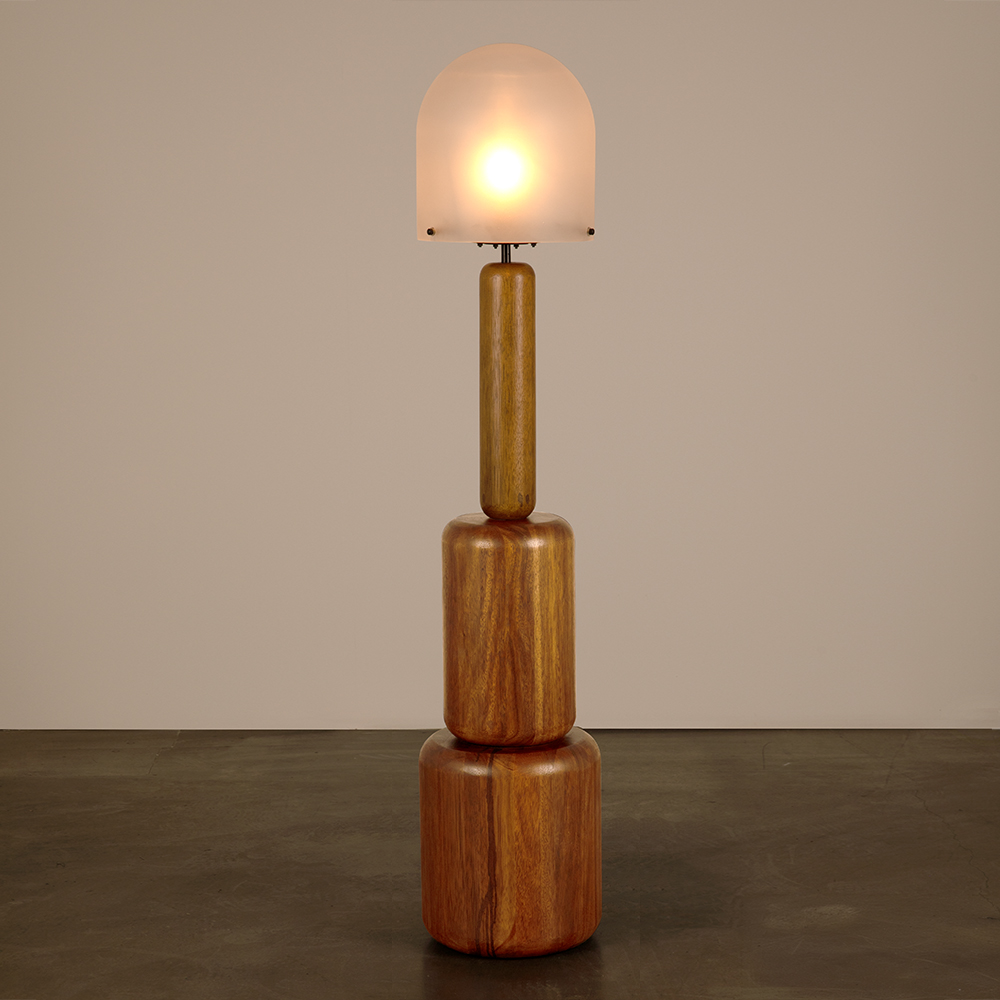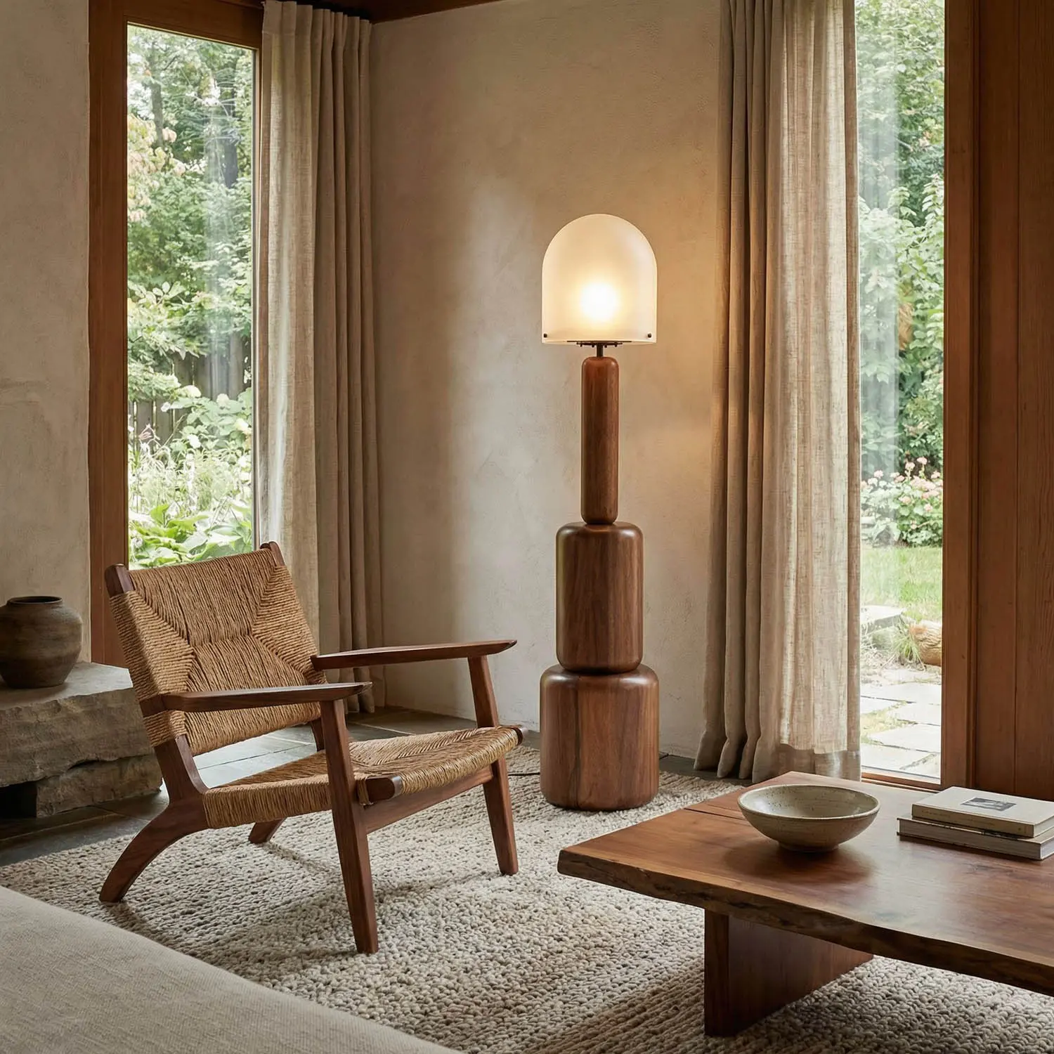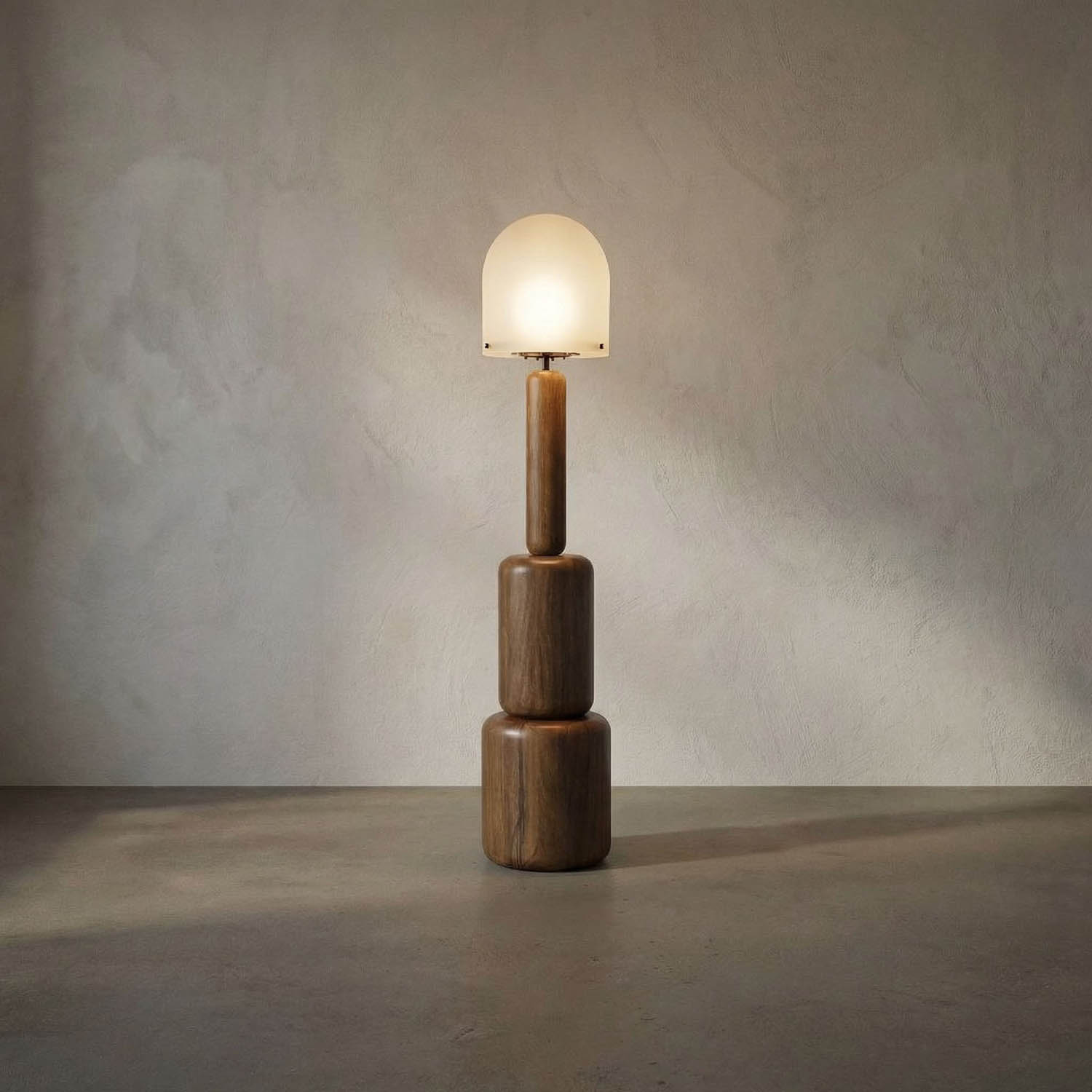 A sculptural floor lamp features stacked cylindrical walnut in a totemic form, topped with a frosted glass dome. The Dark Walnut finish contrasts with soft, luminous glass, highlighting the lamp’s balance, tactile appeal, and sculptural presence.