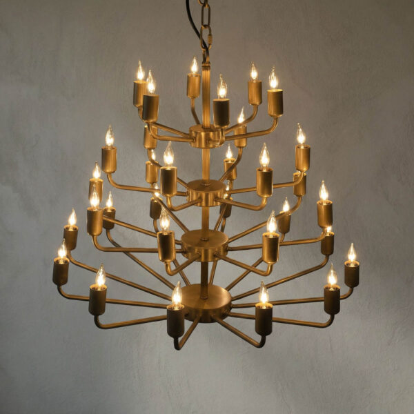 The Montoro Chandelier layers 32 bulbs across four brass tiers, forming a striking silhouette that feels both structured and weightless.