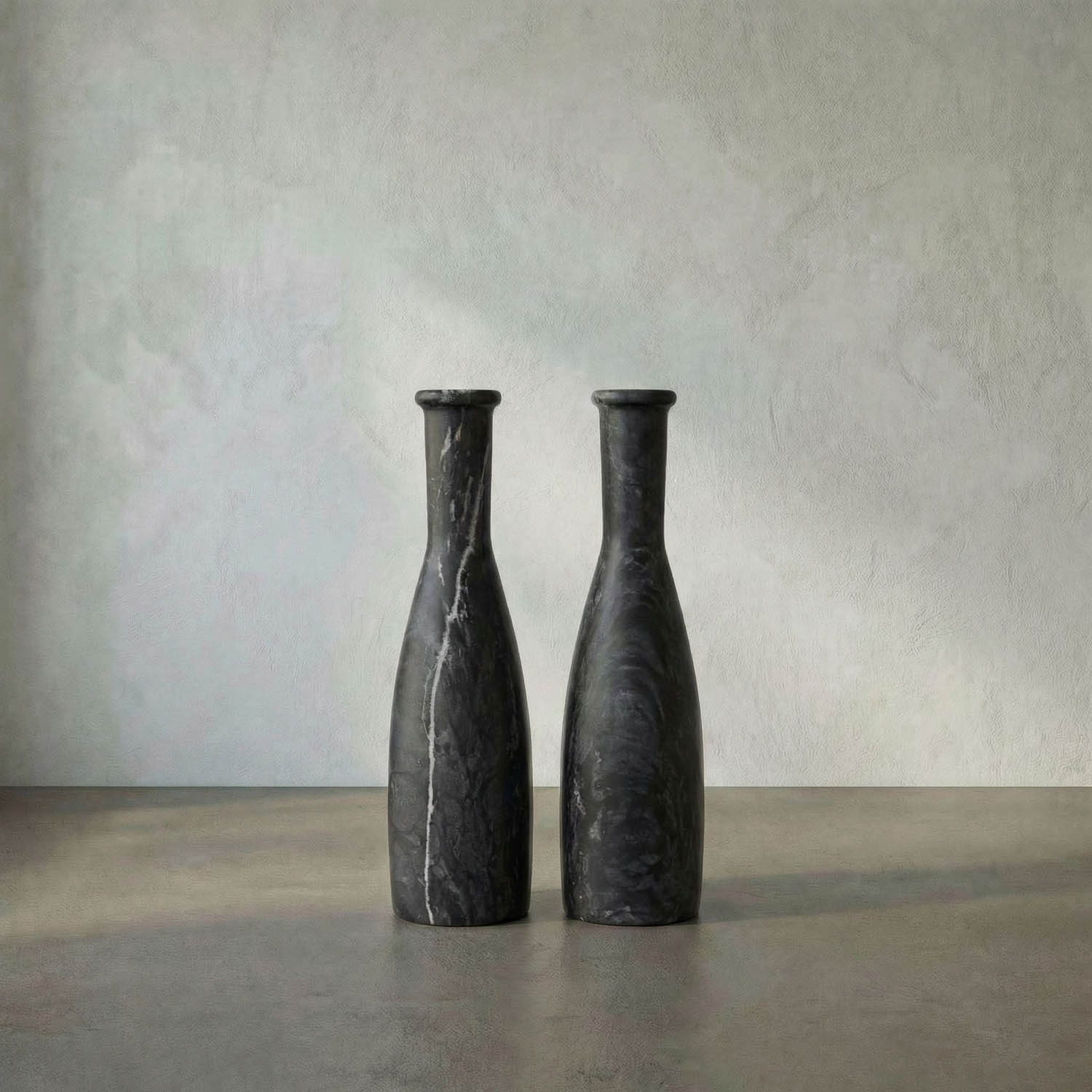 The Moris Candle Holder set features two tall, hand-carved black marble pieces with a sleek, minimalist silhouette. Their height and natural veining add sculptural elegance to modern or classic settings.
