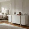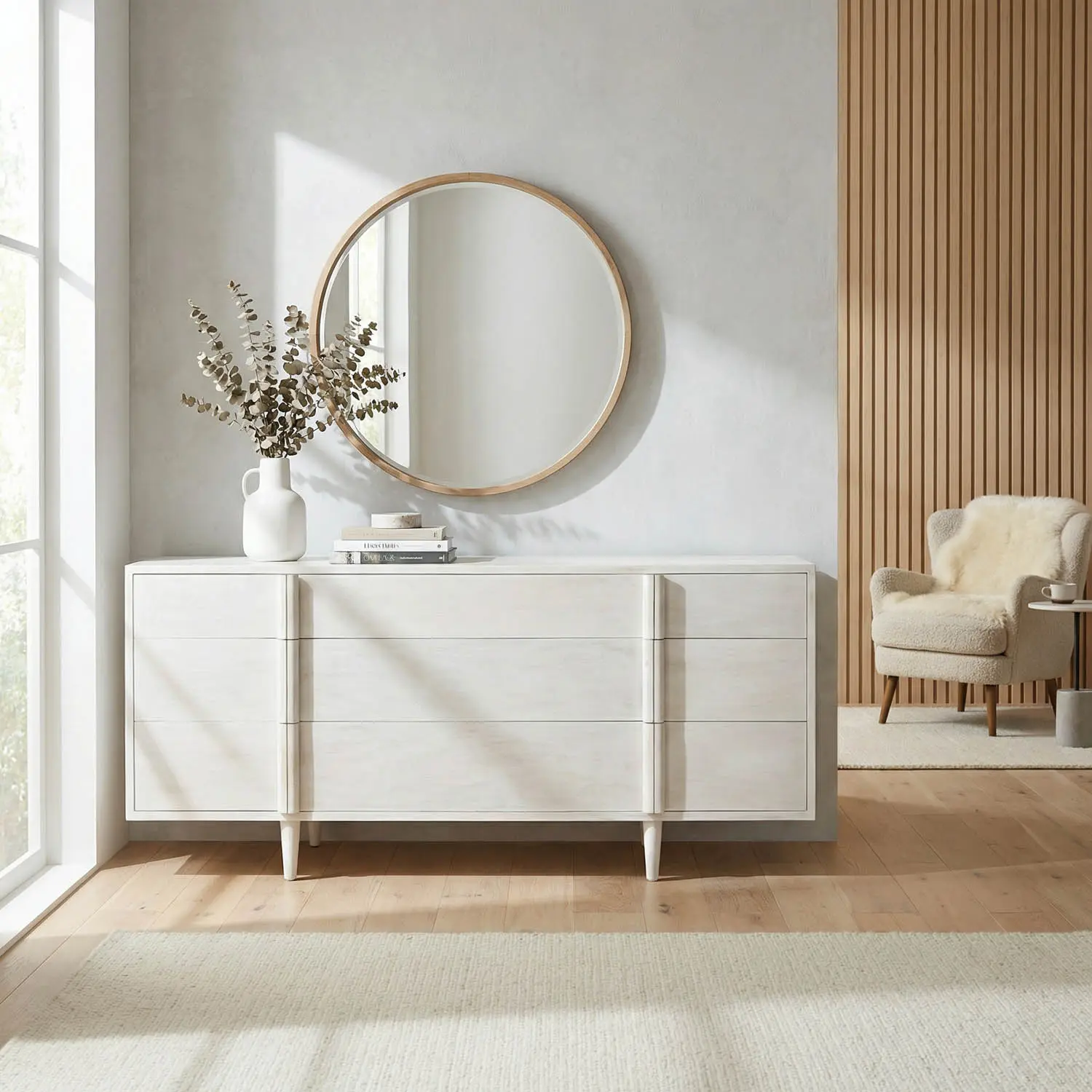 This sleek dresser, finished in our White Wash finish, features clean lines, tapered legs, and nine spacious drawers, combining modern simplicity with practical storage in a timeless, minimalist design.